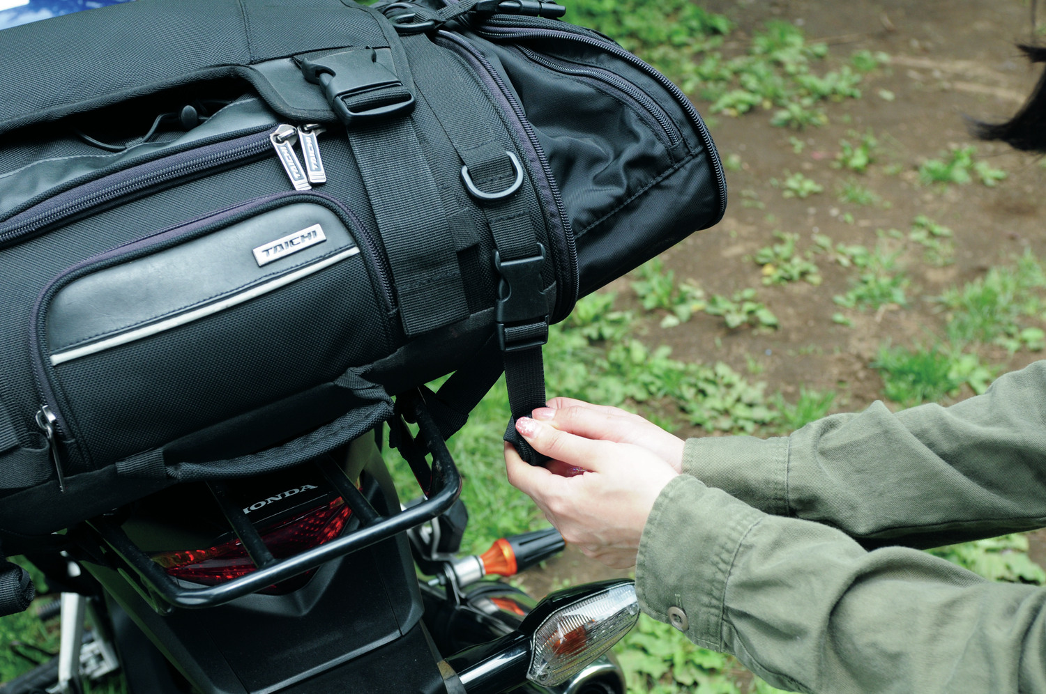 ツーリング先で荷物が増えるのはよくあること。そんな時に便利なのが拡張機能です。 ・容量可変ファスナー付き 必要に応じて容量を広げられる。 ・サイドバッグとのセットアップ 積載力を大幅にアップできる。 ・バッグ上面にマットや寝袋を固定できる仕様 大型装備を効率的に積載可能。