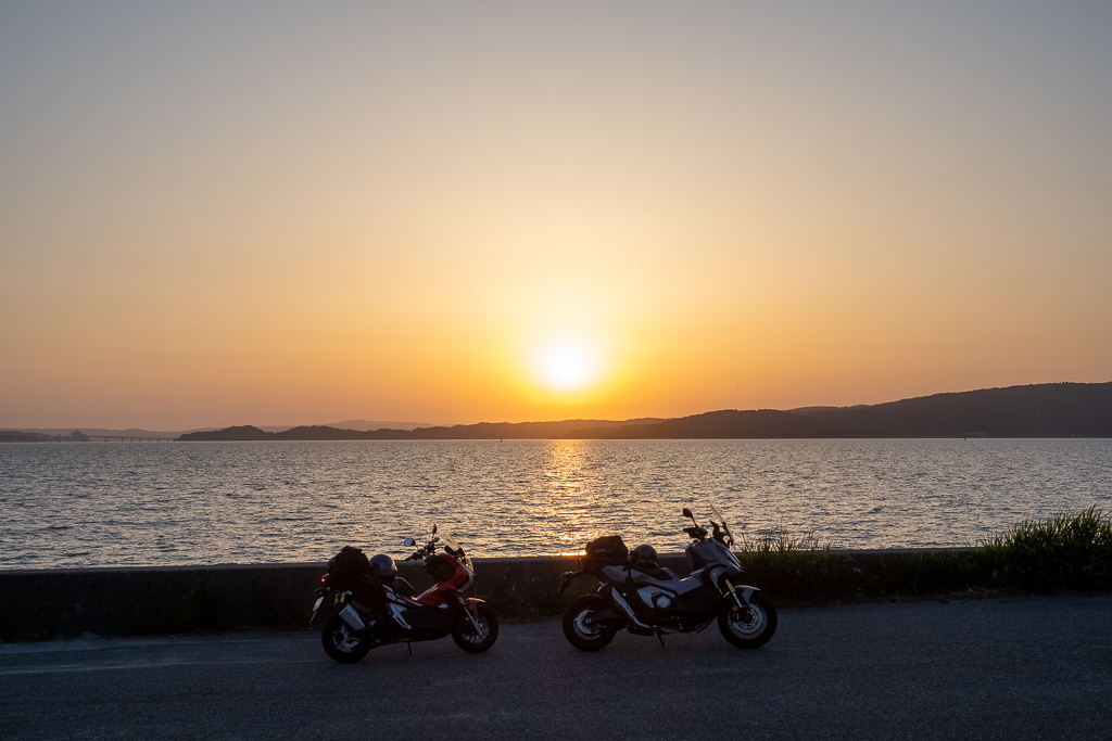 太陽はだいぶ傾いてきたが、日没まではまだ時間はある。高速で一気に富山へ向かうのはもったいないので、七尾市街からは国道160号へ。さらに能登島の対岸を走る県道246号でひたすら海岸線をトレースしようと考えた。 しかし、途中で能登島の向こうへ沈もうとしている美しい夕日が目に入ったので、バイクを停めた。美しいサンセットのひとときを楽しんだら、さらに先に進むのを止めて、国道160号線へ戻った。 尾根を越えると富山湾沿いの快適なシーサイドロード。次第に夜の世界に変わっていく中、気持ちよくバイクを走らせた。七尾大泊ICから能越自動車道に入って南へ進み、髙岡ICで高速を降りた。この先は去年天気と渋滞に苦しんだ道で、それを思い出しながら走って、富山IC近くのホテル到着で2日目が終わった。 舛木さんと一緒に走るのは今日が最終日。明日はそれぞれ好きなルートでソロツーリングを満喫して帰宅することとなった。