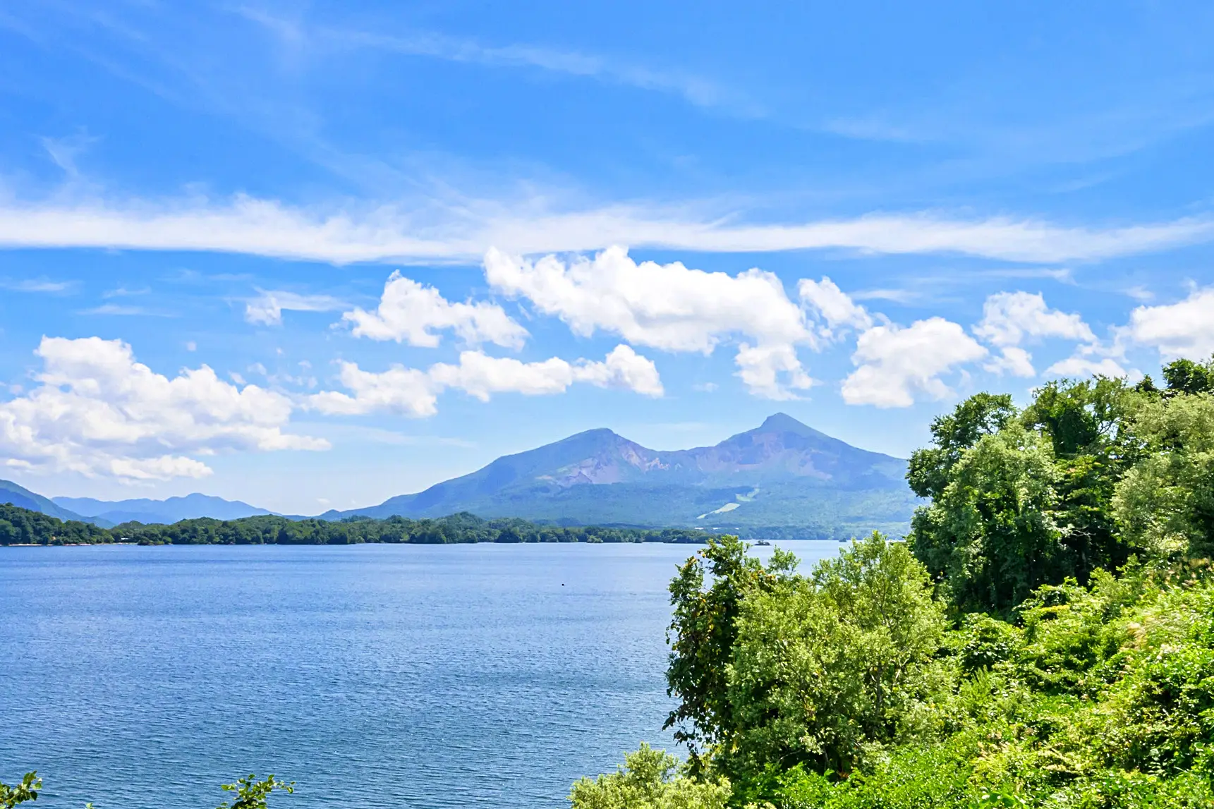 桧原湖越しに見る磐梯山。裏磐梯は表磐梯とはまったく違う顔をしている