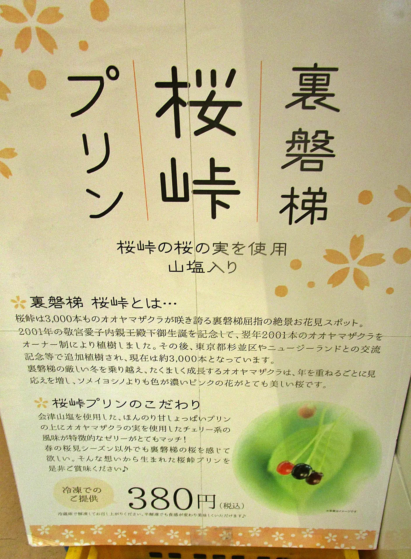 「道の駅 裏磐梯」の山塩入り「桜峠プリン」。桜峠は国道459号の峠