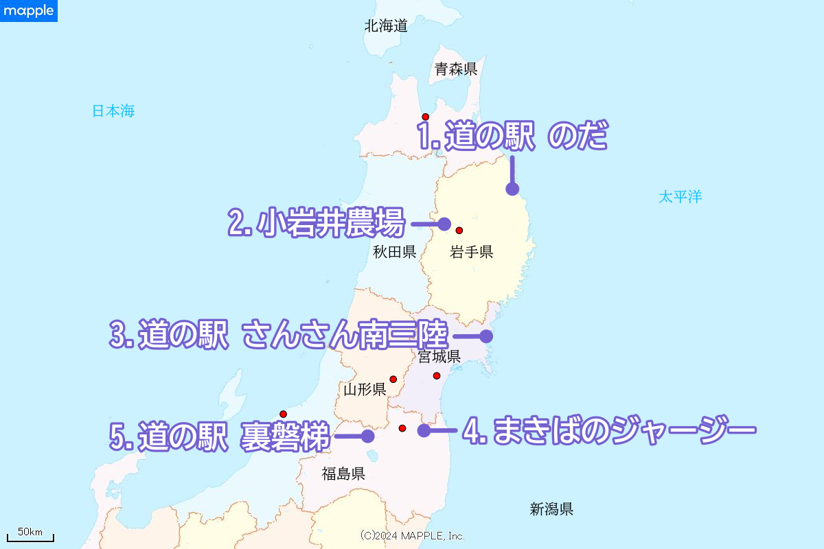 1.道の駅 のだ 2.小岩井農場 3.道の駅 さんさん南三陸 4.まきばのジャージー 5.道の駅 裏磐梯