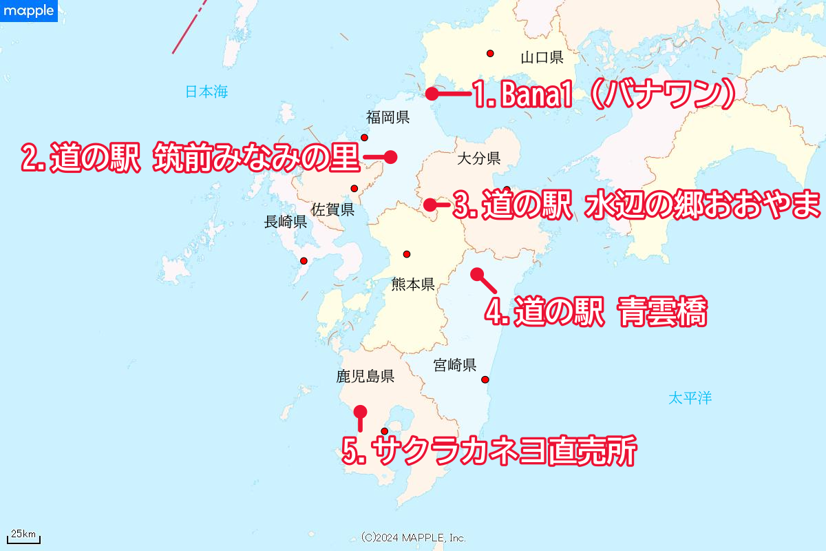 1.Bana1(バナワン) 2.道の駅 筑前みなみの里 3.道の駅 水辺の郷おおやま 4.道の駅 青雲橋 5.サクラカネヨ直売所(よしむらや)