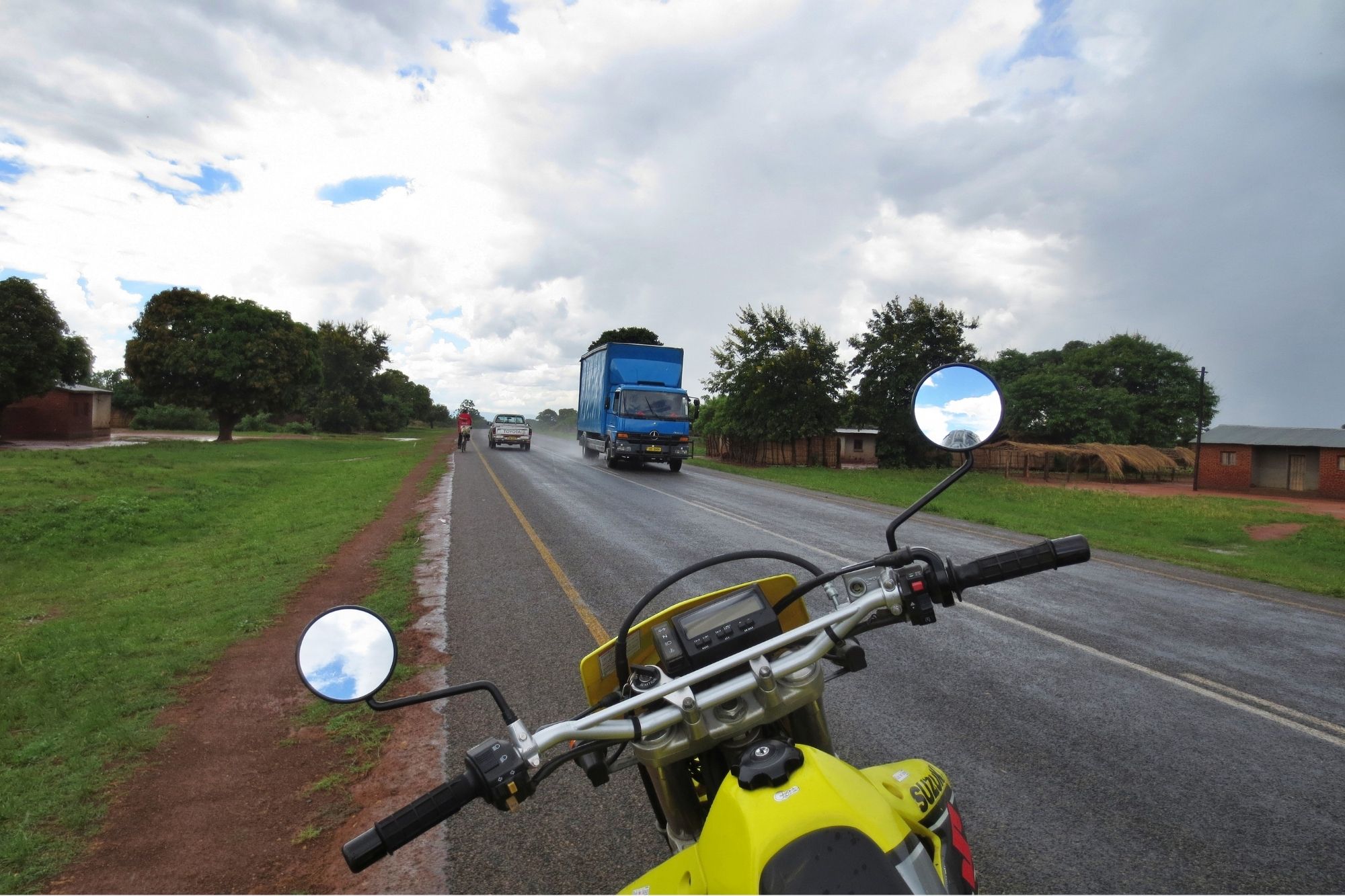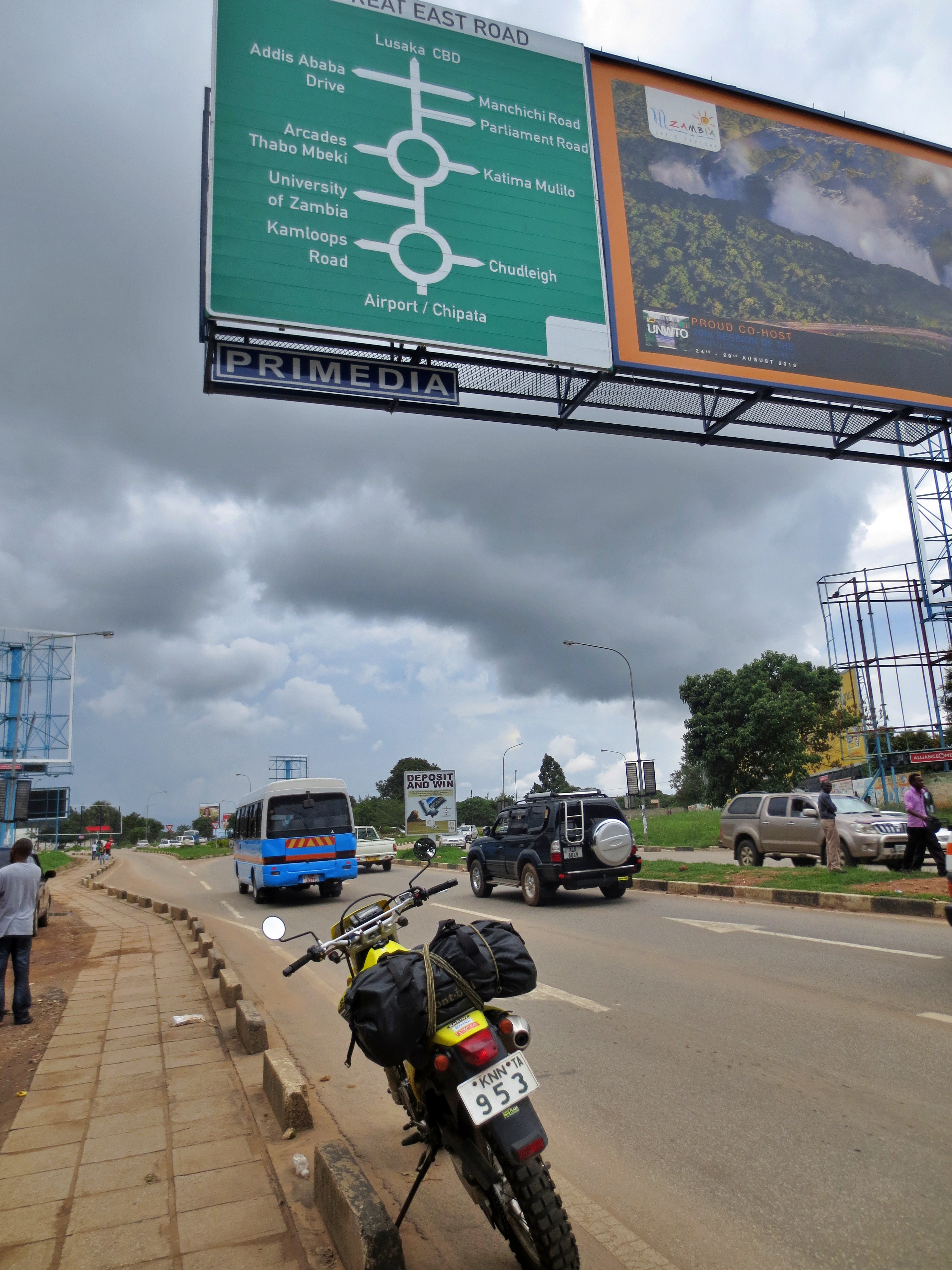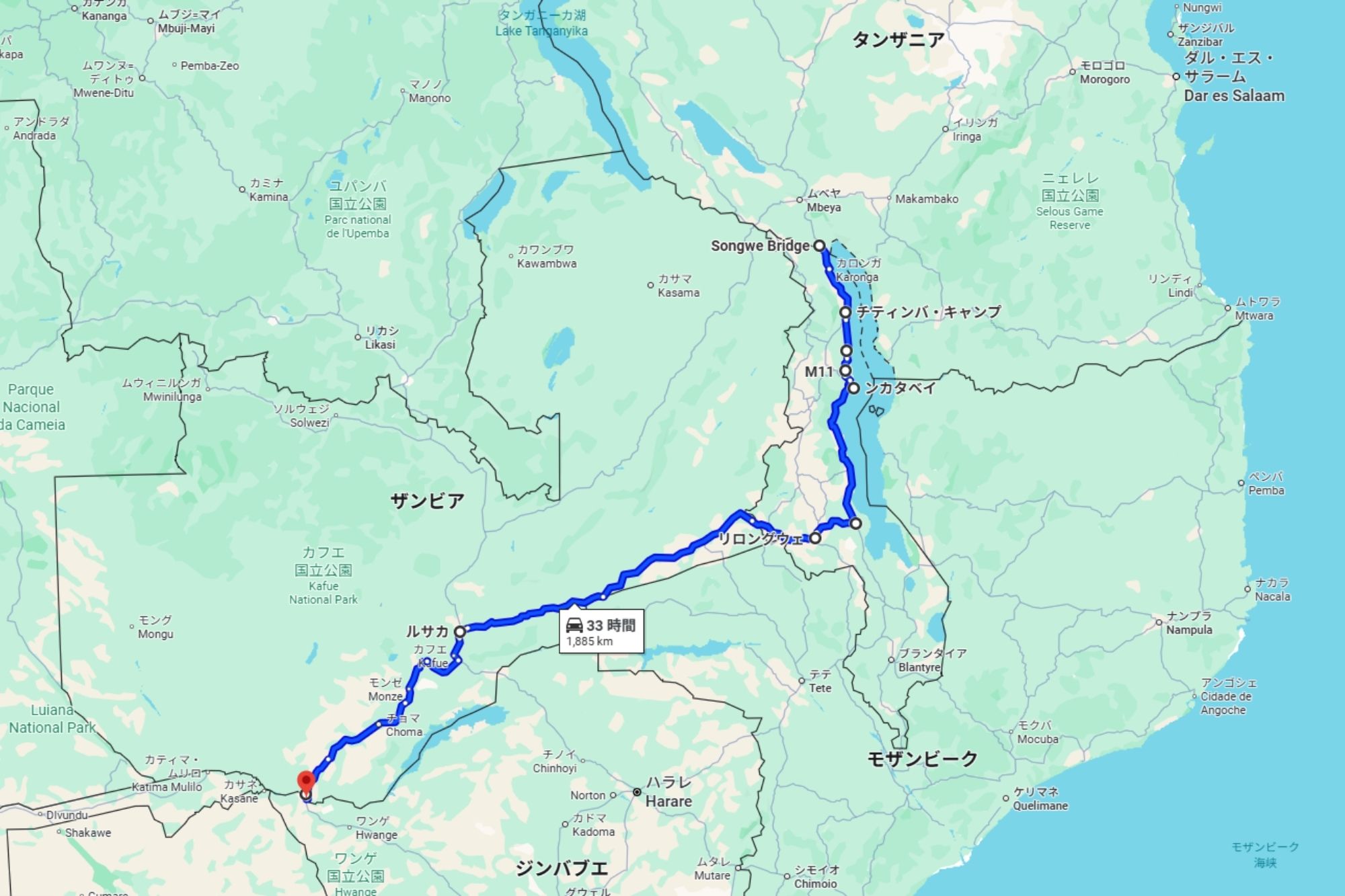 南部に入っていくと、交通量は少しは多くなった。首都のリロングウェに近いサリマでは大統領一行とすれ違った。警官が大勢出て、すべての交通を止める。その中を大統領一行の乗った何台もの車が猛スピードで走り抜けていく。どの車に大統領が乗っているのかはわからなかった。 サリマで長かったマラウィ湖畔を離れる。首都のリロングウェに向かっていくと交通量が一気に多くなった。ゆるやかな登り。バイクを止めると、我々は高台から雄大な風景を見下ろした。首都のリロングウェに到着するとファストフード店で昼食。ハンバーガーとフライドポテトを食べた。 リロングウェから130キロ走るとザンビア国境に到着。国境で両替をすると1USドルが5クワチャに。1ザンビア・クワチャは約20円だ。 国境近くの町、チパタで給油し、郊外の「ママルーラ・キャンプ場」に泊まった。テントを張り終えると、まずはキャンプ場内のバーでザンビア産ビールの「モシ」をキューッと飲み干す。1本10クワチャ(約200円)。そのあとキャンプ場内のレストランで夕食。イタリア料理の「ラザニア」を食べた。ザンビアの「辺境の地」といってもいいようなチパタのキャンプ場で食べる「ラザニア」の味は格別だ。翌朝は、キャンプ場内のマンゴーの木の枝に飛びつき、食べごろの実を取って、顔中をベトベトにしながらたてつづけに食べた。マンゴーはぼくの大好物なのだ。