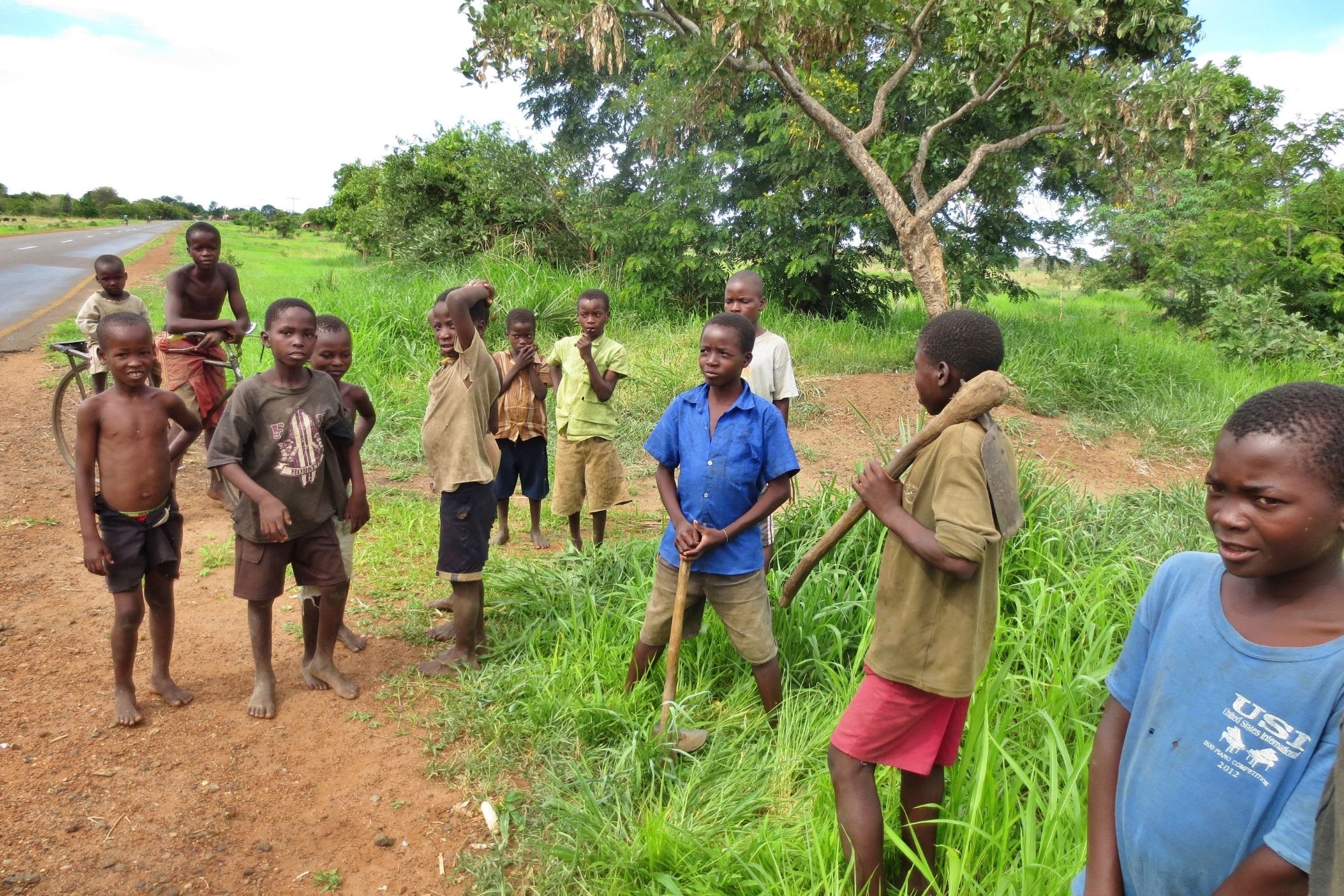 街道沿いで小休止。近くの村人たちがやってくる