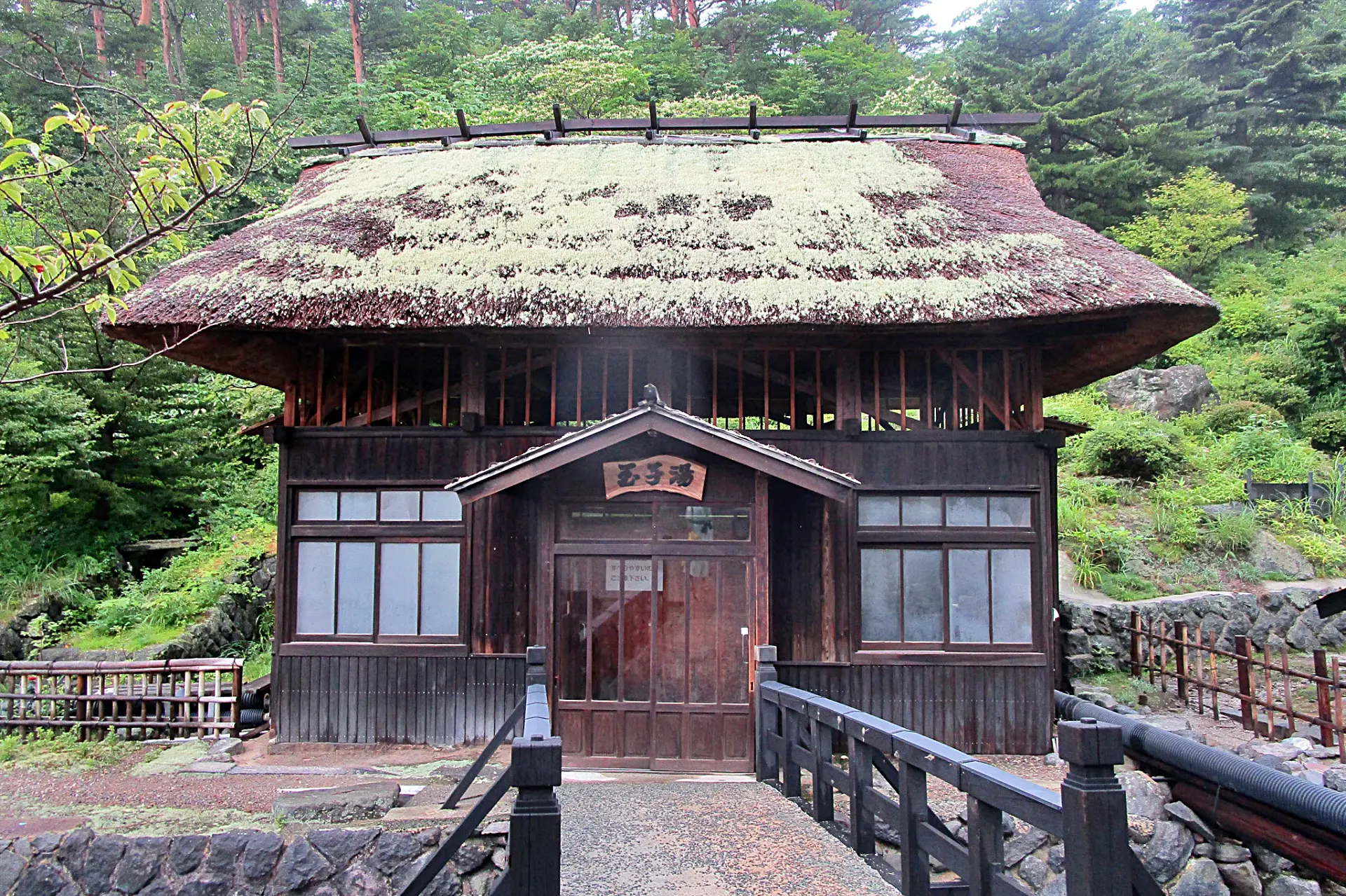 【高湯温泉「旅館玉子湯」】 高湯温泉は奥羽三高湯。磐梯吾妻スカイラインの北入口にある。「旅館玉子湯」の茅葺の湯小屋は古風。河原には木枠の大露天風呂がある。 ツーリングマップル➡東北 P.24 D-6