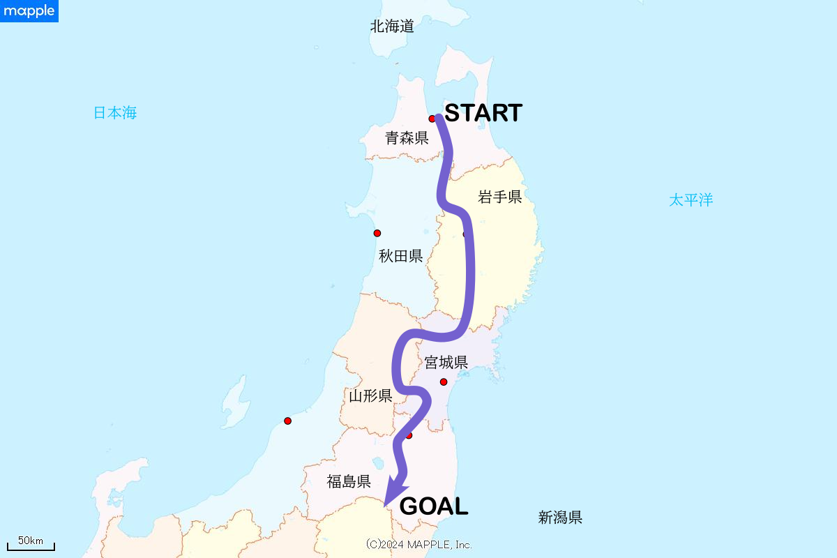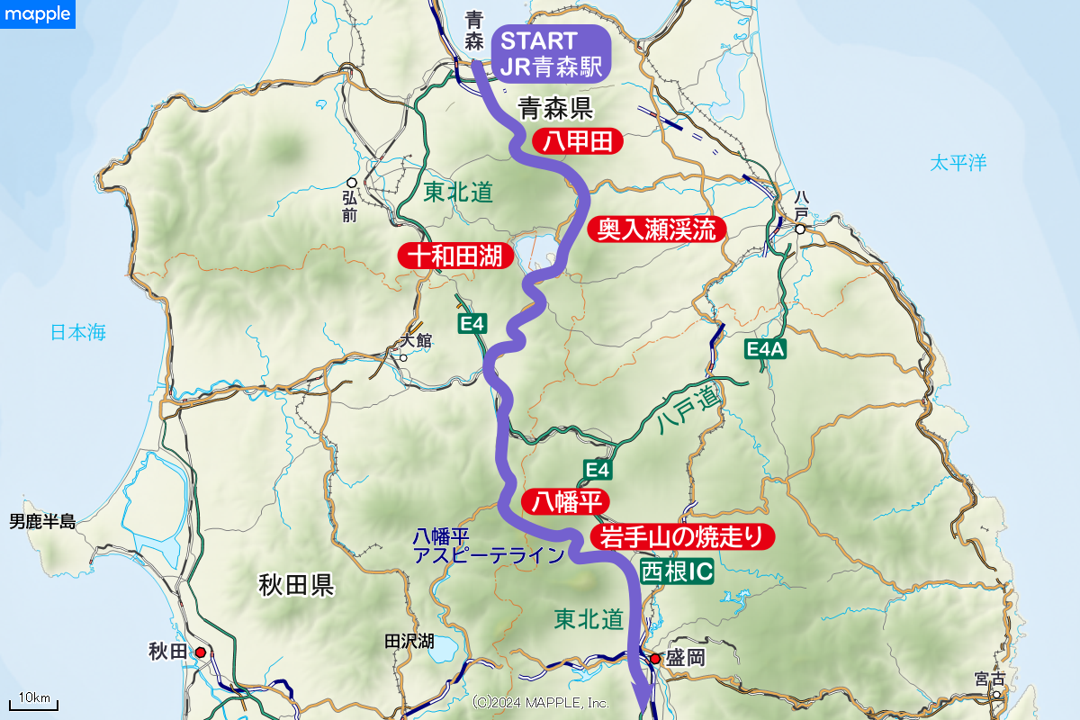 START:JR青森駅 ➡ツーリングマップル東北 P.94 E-2 GOAL:JR白河駅 ➡ツーリングマップル東北 P.8 M-5 青森からは国道103号で八甲田から奥入瀬渓流、十和田湖を通り、発荷峠を越えます。ここまでが第1ステージ。つづいて第2ステージの八幡平アスピーテライン、第3ステージの鳴子峡、第4ステージの蔵王エコーライン、第5ステージの磐梯吾妻スカイライン編が続き、白河がゴールです。