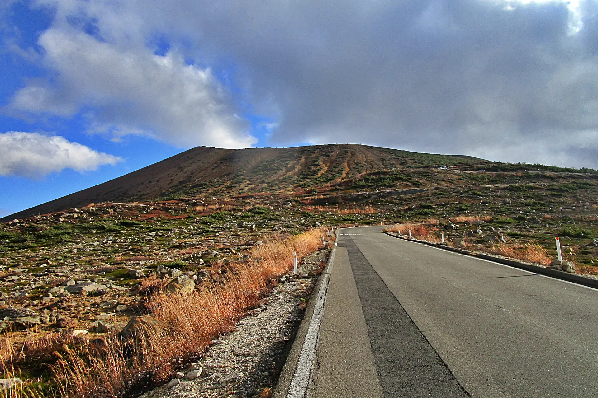「八甲田・十和田ゴールドライン」の国道103号は日本一の紅葉ライン。青森から一気に「八甲田」に向かって登っていくと、「萱野高原(かやのこうげん)」(ツーリングマップル東北 P.94 G-5)からは八甲田山の主峰群を一望する。