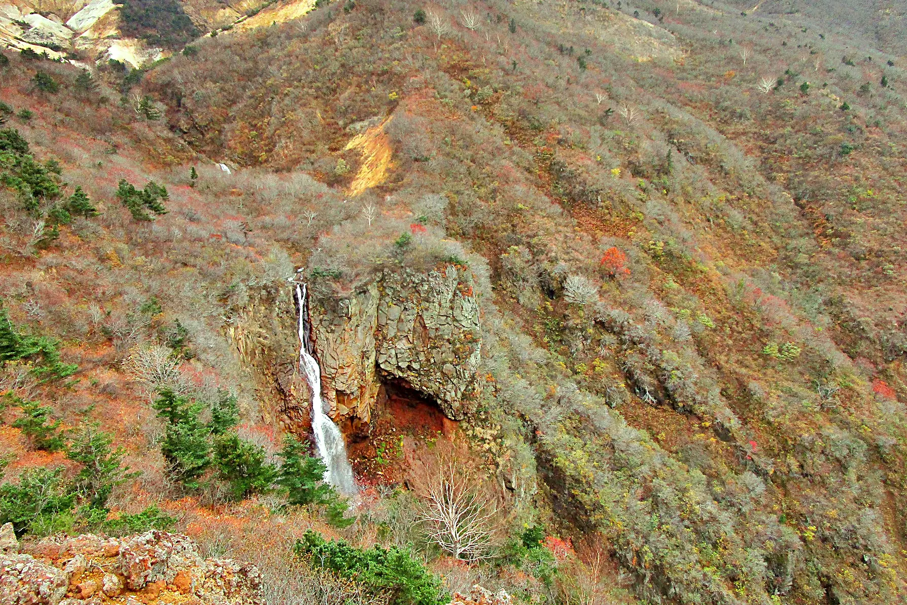 不動尊近くの展望台から見る不動滝。澄川の谷は一面の紅葉