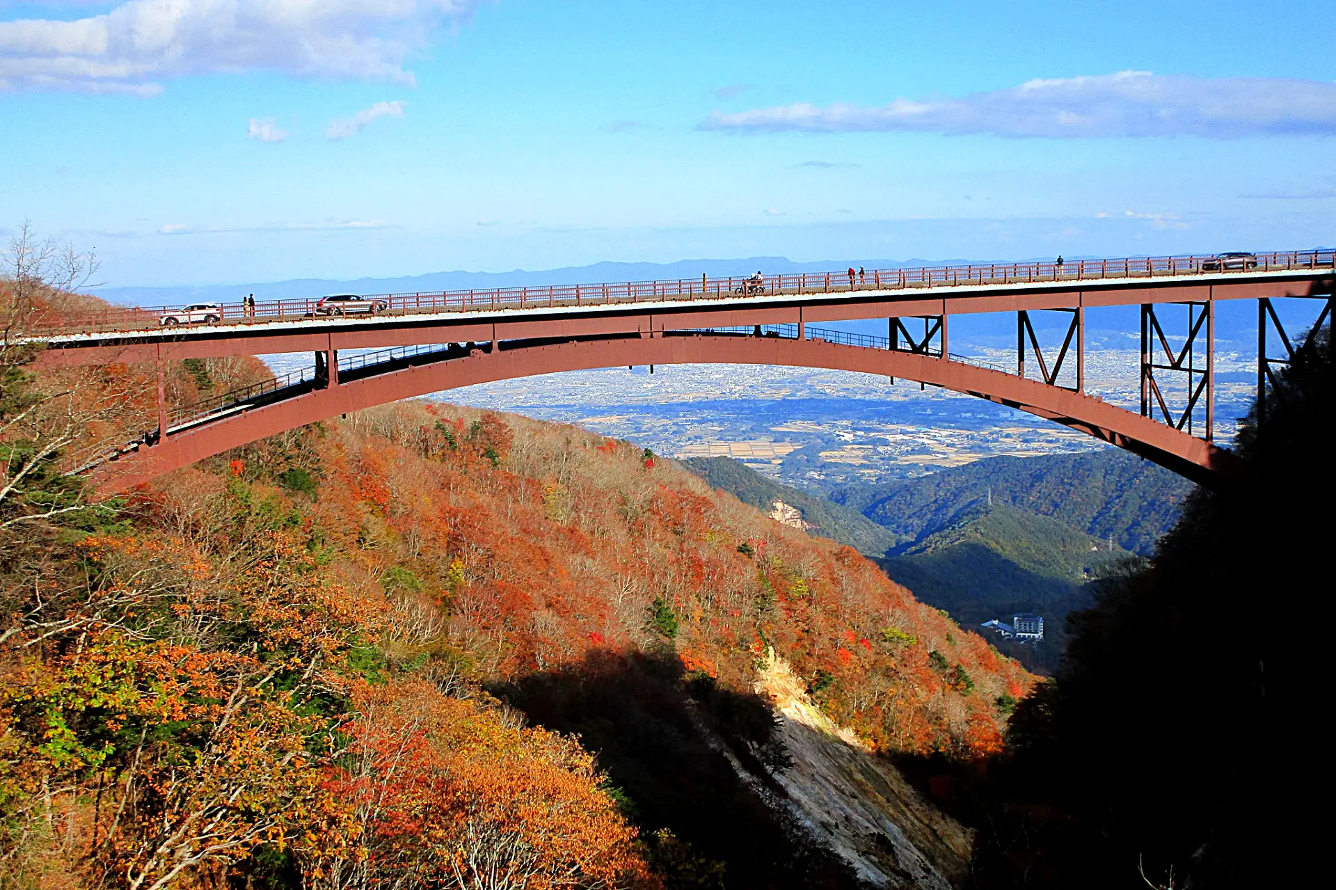 東北道の福島西ICから、奥羽三高湯のひとつ、「高湯温泉」から「磐梯吾妻スカイライン」に入って行くと、いきなり見事な紅葉を見る。さすが東北屈指の紅葉ライン、磐梯吾妻スカイラインのことだけはある。 絶景ポイントのつばくろ谷にかかる「不動沢橋」(ツーリングマップル東北 P.24 C-6)からも、すばらしい紅葉が見られる。橋の向こうの、福島市街地の「信夫山」や阿武隈山地の「霊山」も紅葉している。