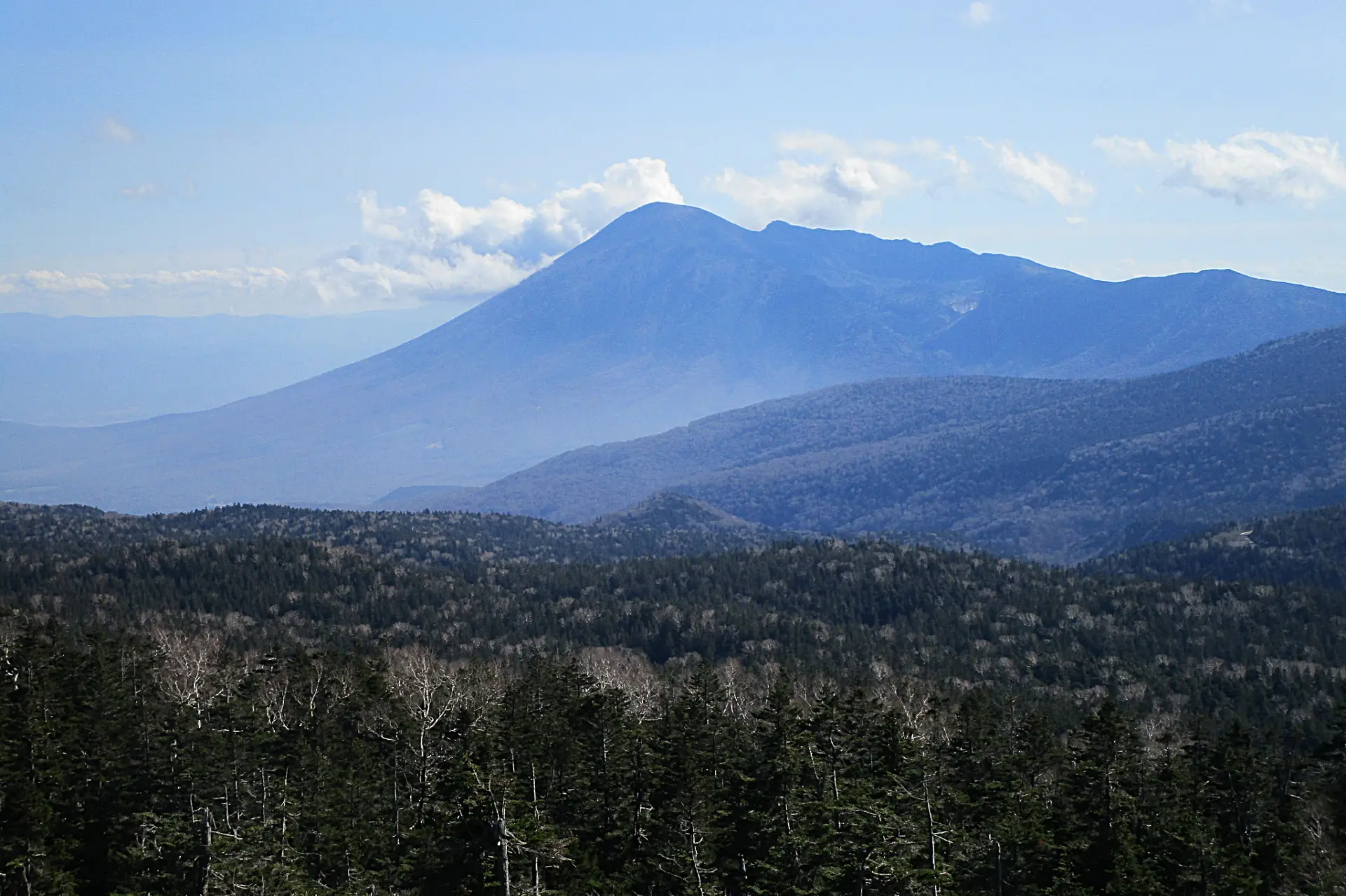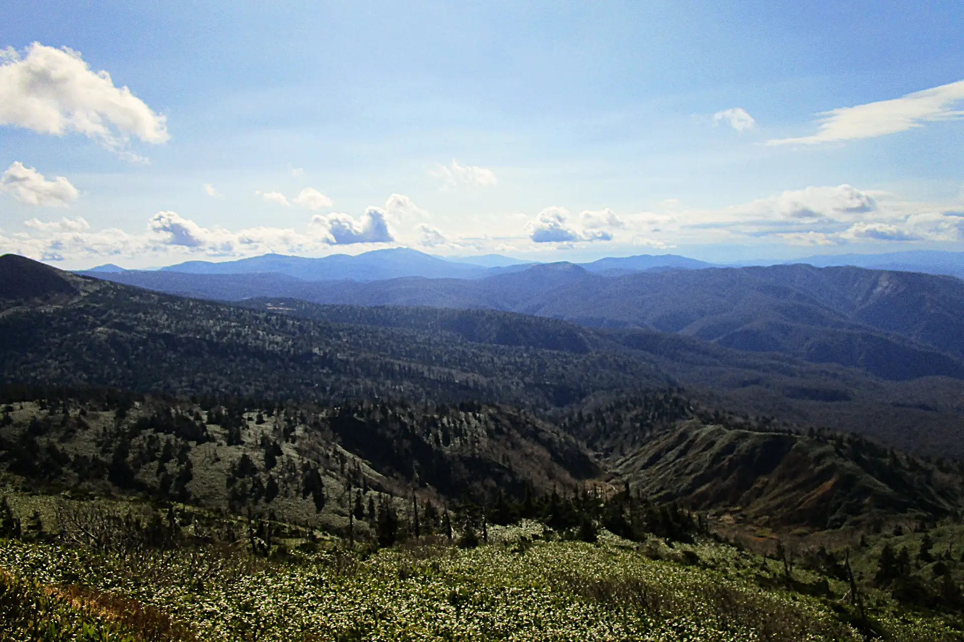 大深沢(おおぶかさわ)展望台(1560m)からの眺め。一番奥に鳥海山が見える※ツーリングマップル東北 P.73 H-1
