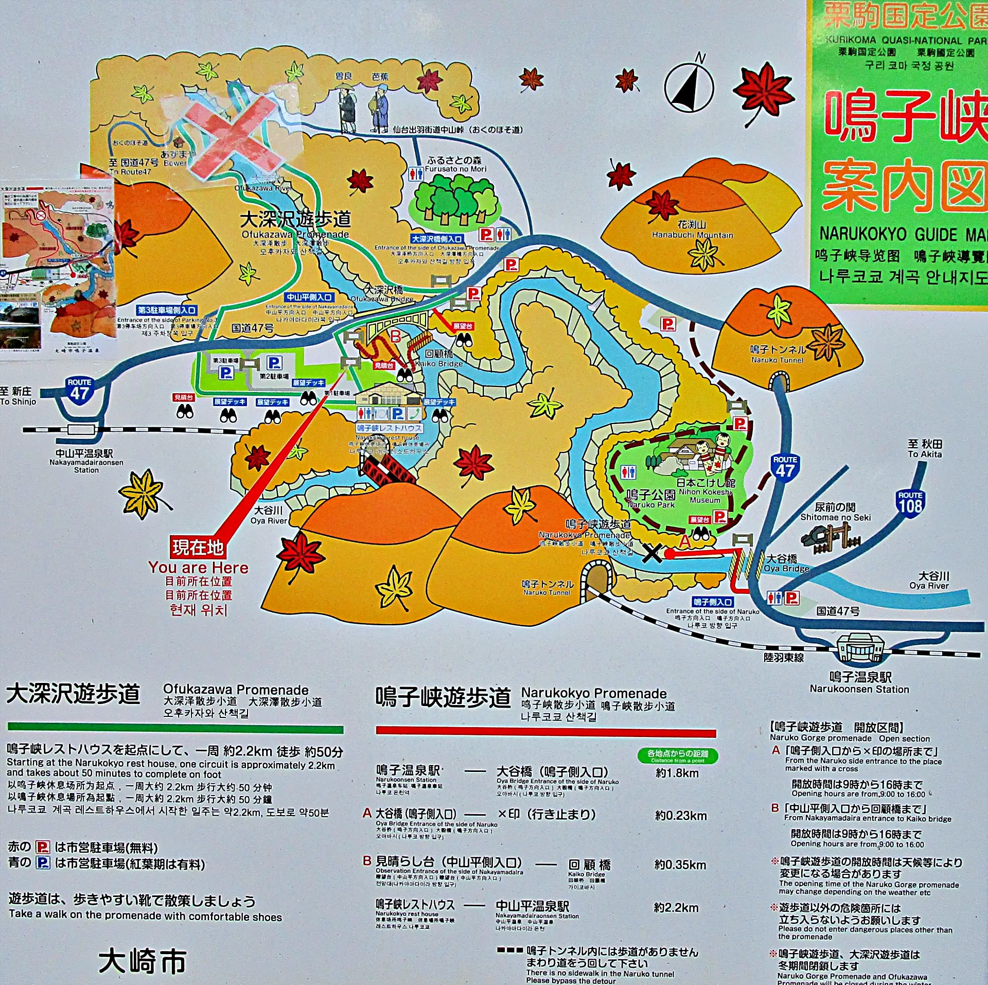鳴子峡の案内図。「鳴子峡レストハウス」が渓谷散策の起点