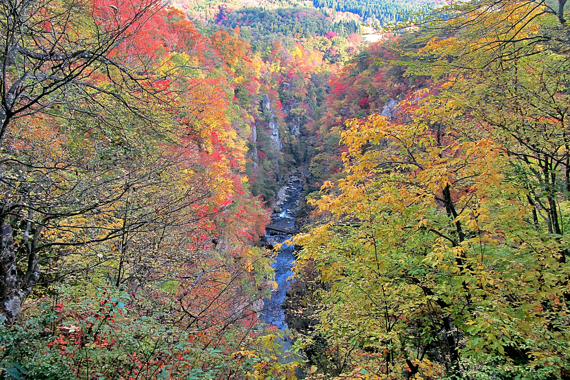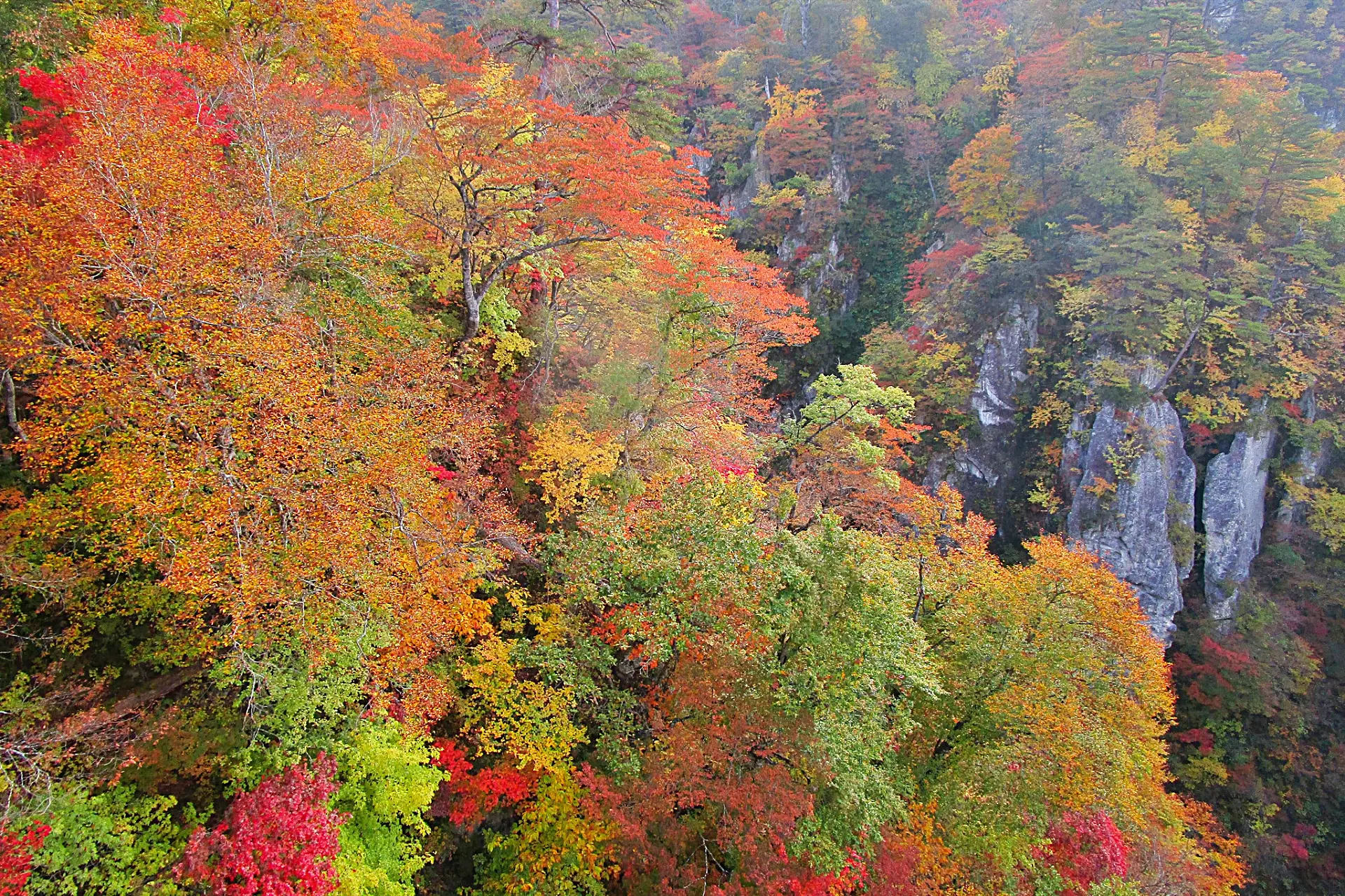 東北道の古川ICから国道47号で「鳴子温泉(なるこおんせん)」へ。鳴子温泉を過ぎると登り坂が続き、東北の紅葉の名所、「鳴子峡」(ツーリングマップル東北 P.46 C-4)に到着。まずは「鳴子峡レストハウス」で案内板を見て、鳴子峡の全体像を頭に入れる。深い谷は一面の紅葉。赤や黄色が色鮮やかだ。