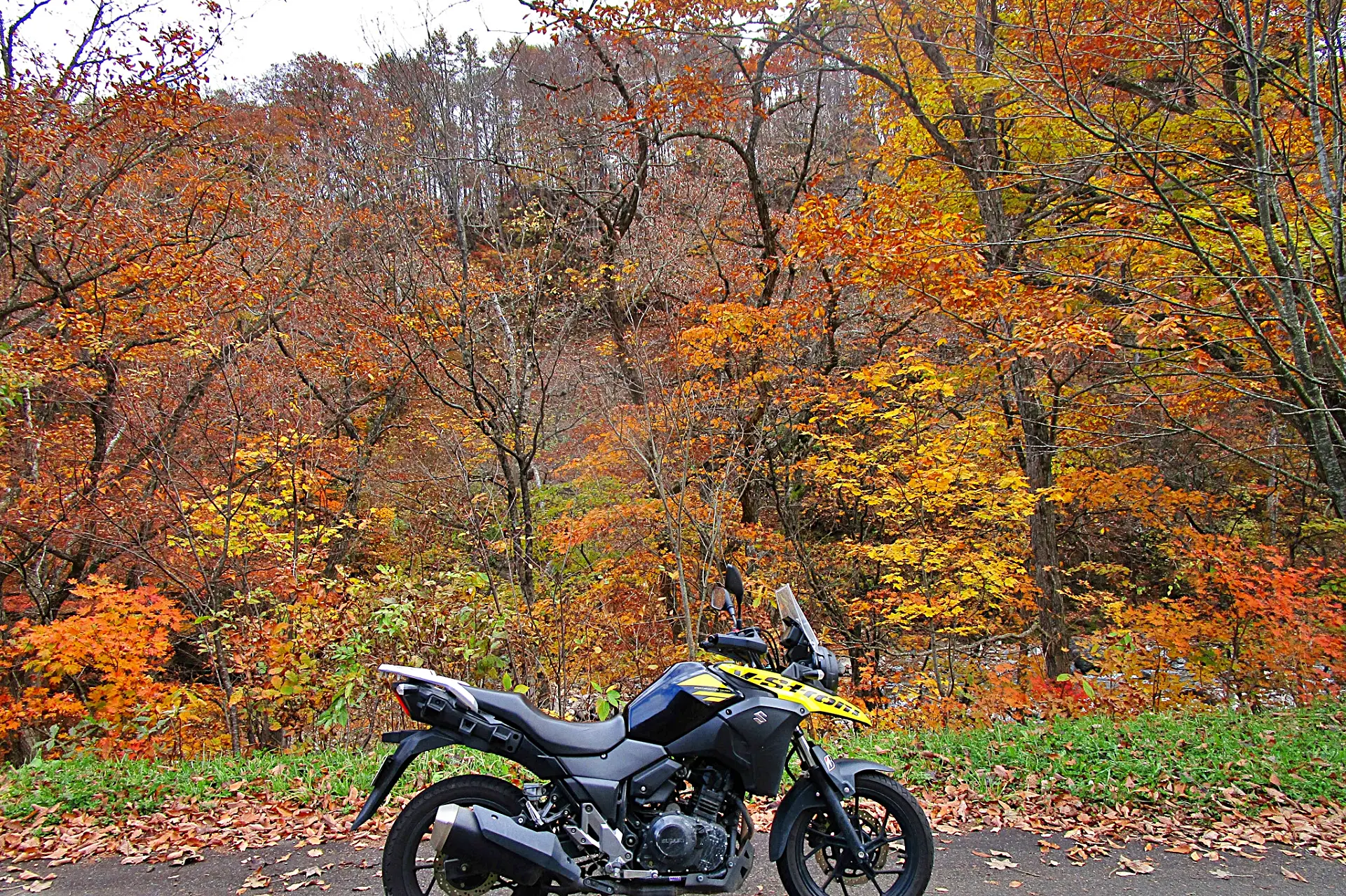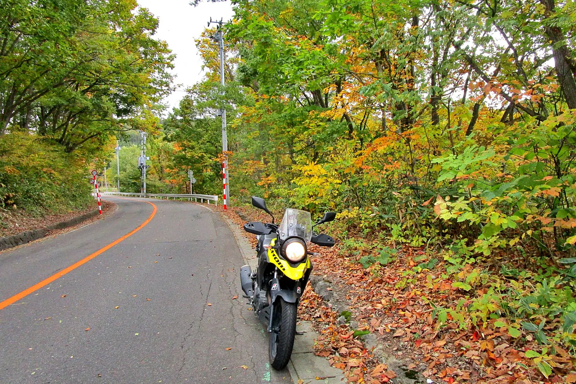 「後生掛温泉(ごしょうがけおんせん)」(ツーリングマップル東北 P.79 G-7)を過ぎると紅葉は終わり、岩手県境の「見返峠(みかえりとうげ)」に到達すると冬枯れの風景。岩手県側を下っていくと同じような冬枯れ→紅葉→緑といった変化が見られる。