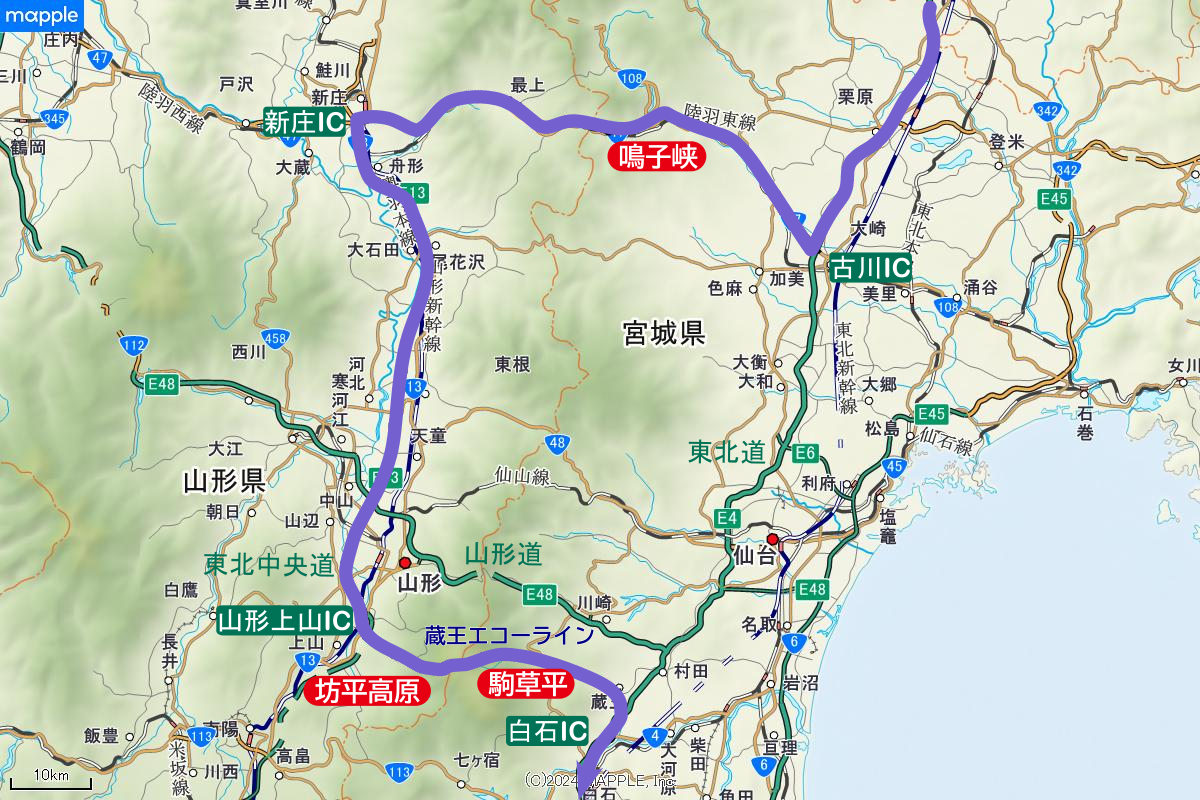 この深い谷をJR陸羽東線が通っている。深い谷の向こう側には国道47号の橋梁も見える。鳴子峡から国道47号は「中山峠」を越える。県境の峠上には芭蕉の『奥の細道』ゆかりの「旧有路家住宅 封人の家(きゅうありじけじゅうたくほうじんのいえ)」(ツーリングマップル東北 P.46 A-4)があり、見学ができる。 山形県側を下っていくと「瀬見温泉」を通って新庄へ。新庄ICで東北中央道に入り、山形上山ICで降りれば第4ステージの蔵王エコーラインだ。
