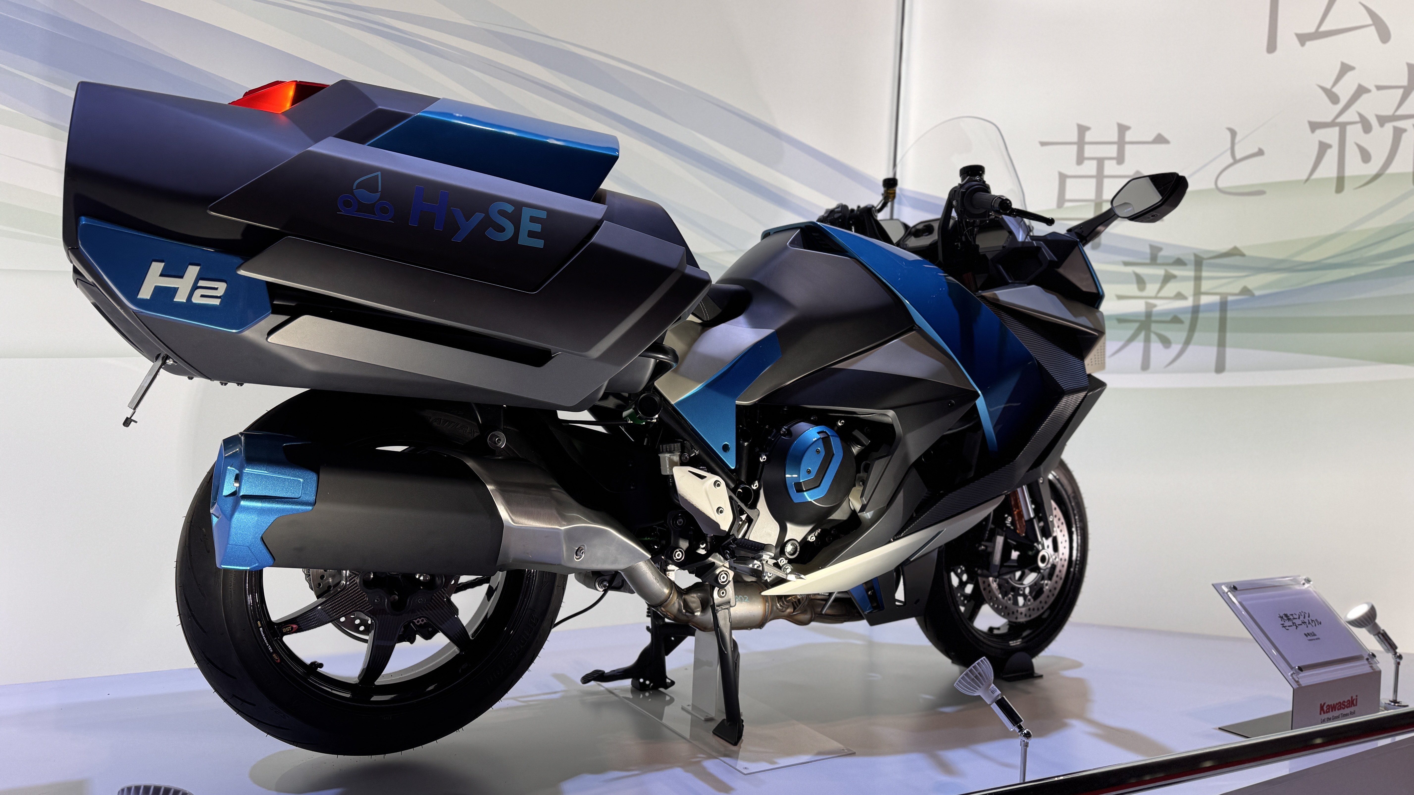 カワサキの水素エンジンバイク。パニアケース部分が燃料タンクになっている。荷物は上に載せてもいいのだろうか・・