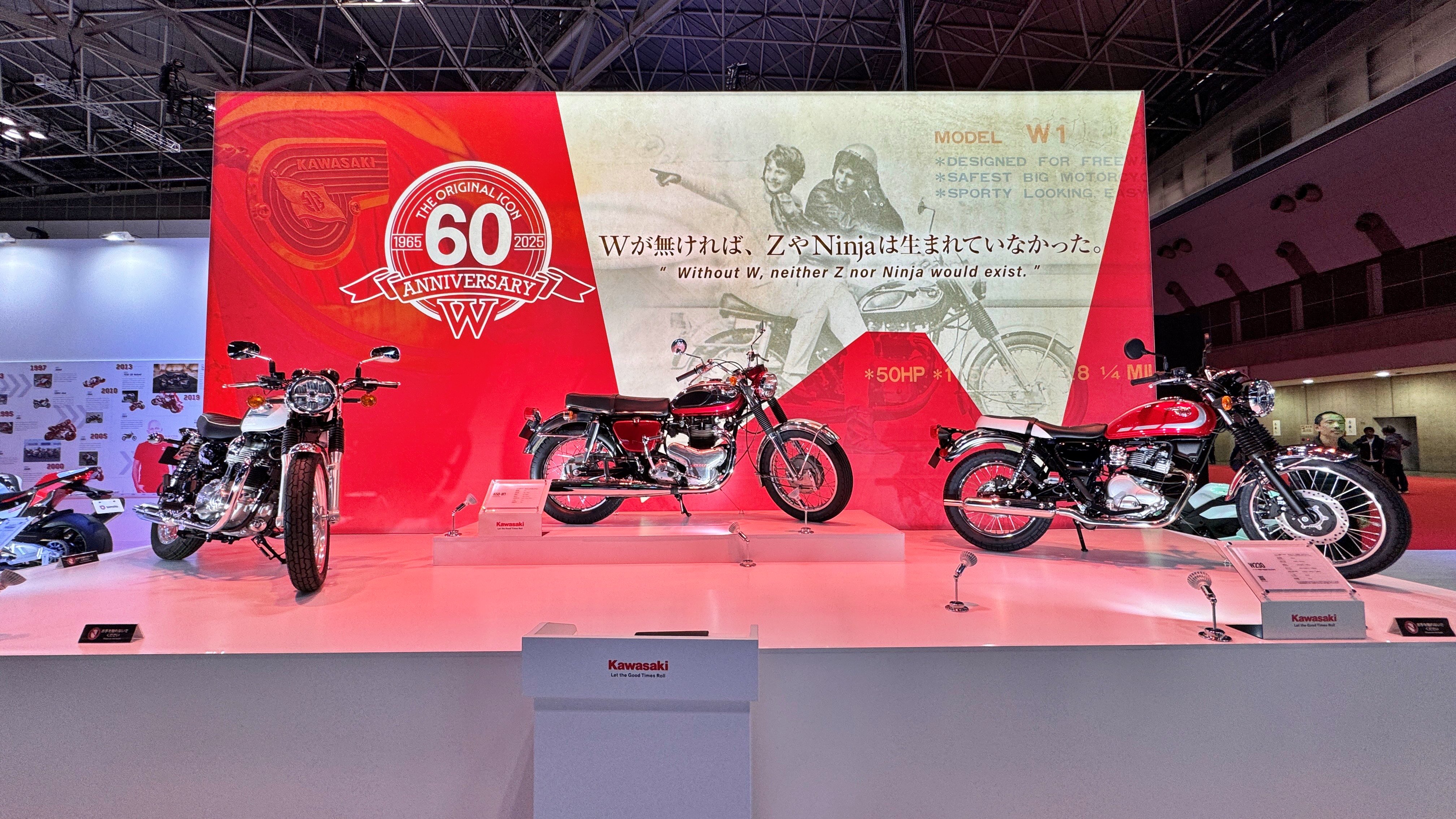 カワサキブースに戻って、「W」シリーズが60周年ということで、W230、650-W1、W800がかっこよく並んでおりました。 朝はベールをかぶっていた新型の「Z900RS SE」および「Z900RS CAFE」も世界初公開。したんですが、なんとスマホの電池切れにより写真が撮れず・・(泣)。