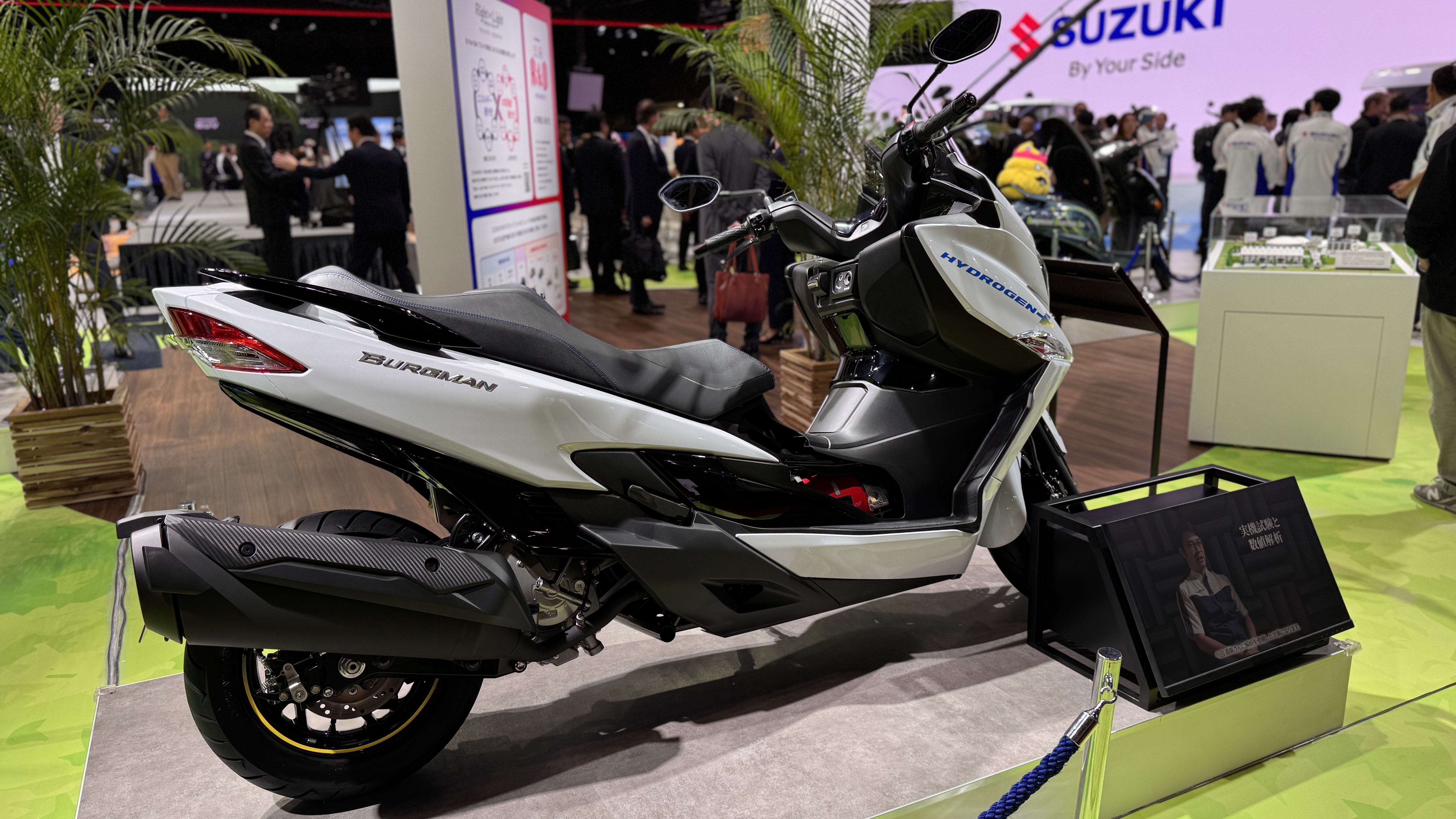 スズキの水素エンジンバーグマン。見た目は現行のバーグマンと比較してもあまり違和感がない