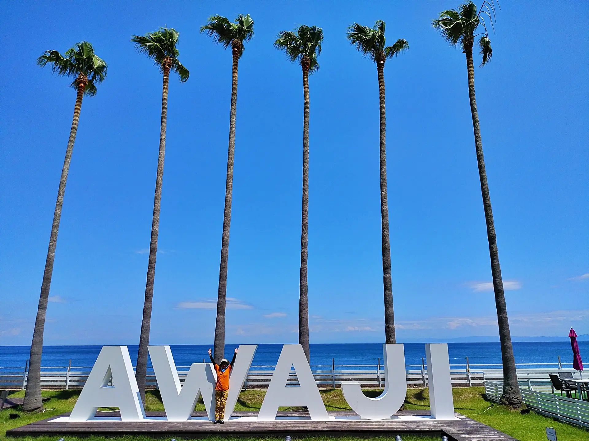 洲本市の「アイガビーチ」にある文字オブジェ。外からも見えるけれど、隣接の「高級芋菓子しみず」で一点以上購入すれば、中に入って撮影できる