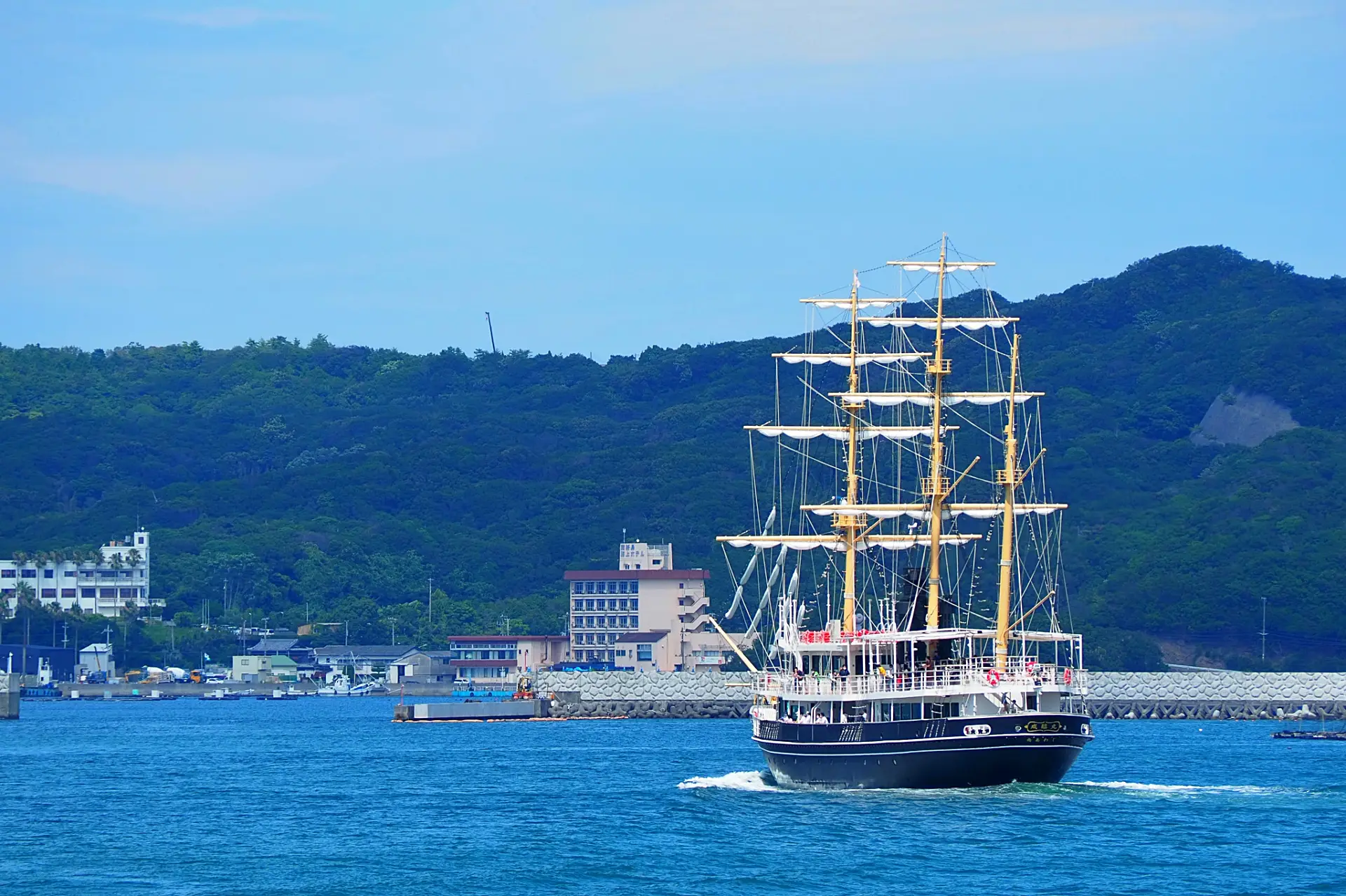 「うずしおクルーズ」は「道の駅 福良」から出航。「咸臨丸」「日本丸」の二隻あり、どちらも大型帆船
