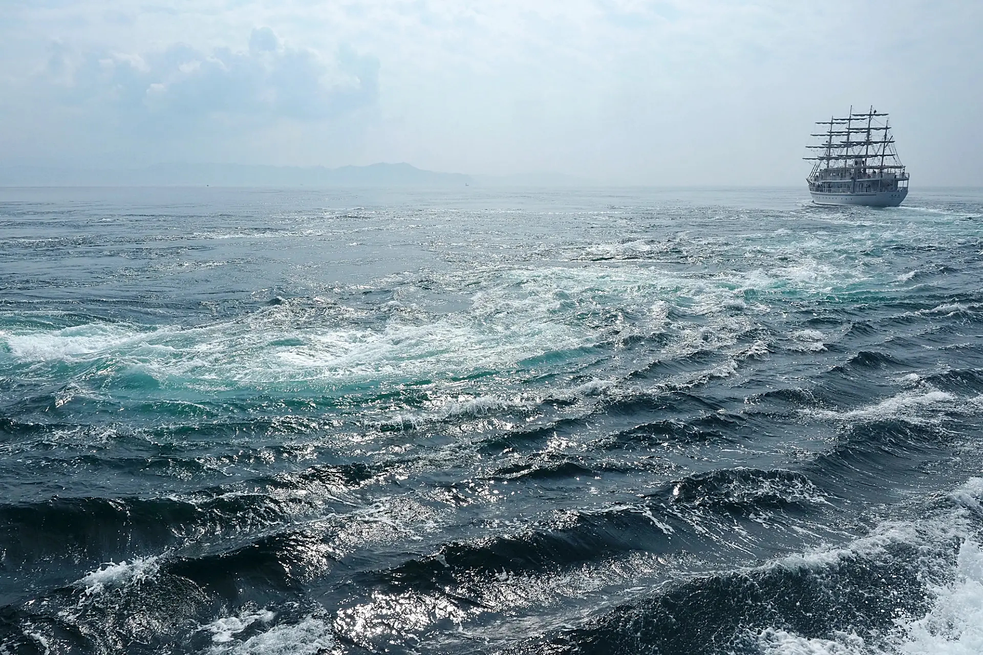 鳴門海峡の渦潮地帯を行く日本丸。ガイドさんの解説もあって楽しい