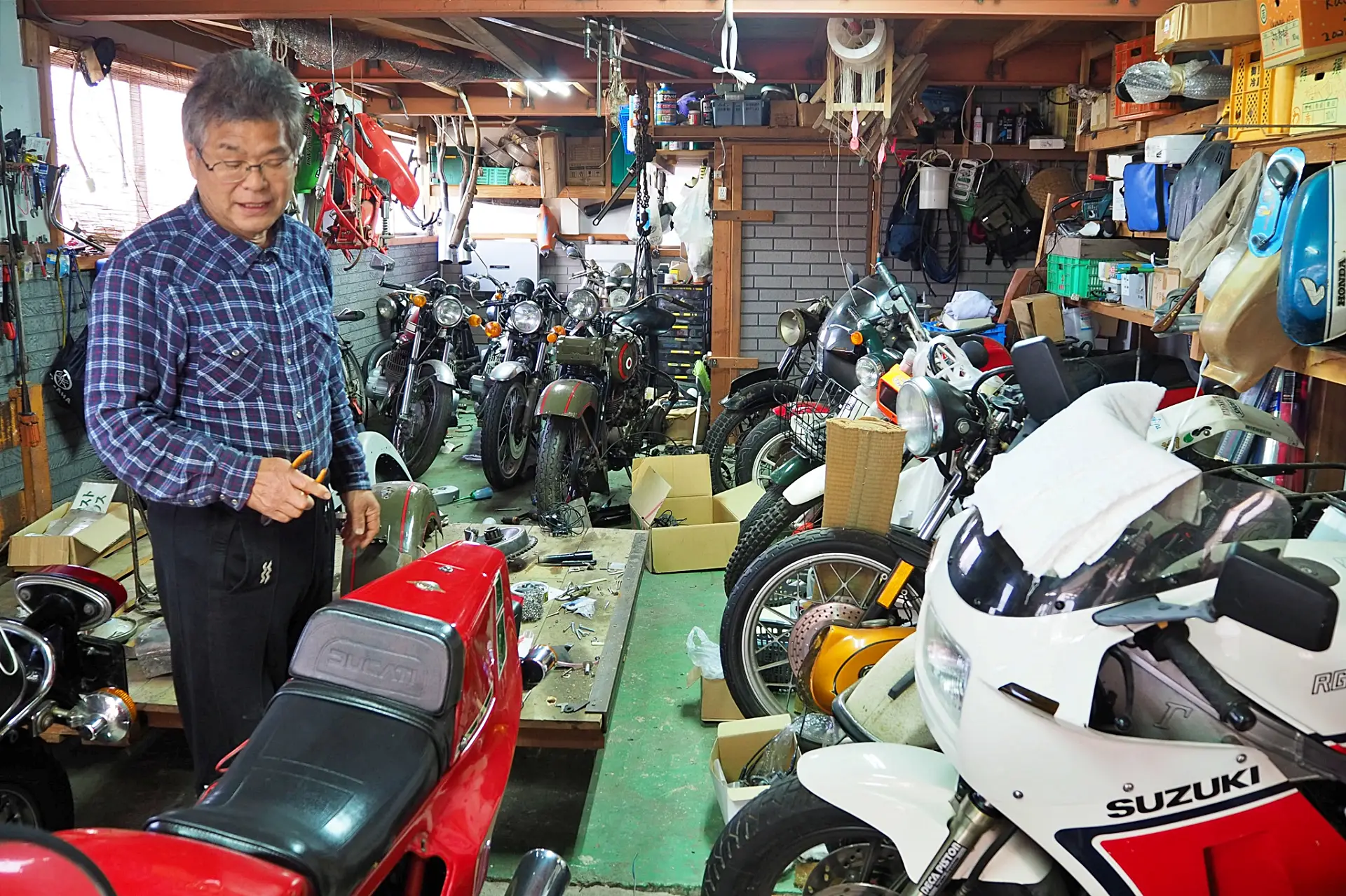 メグロや陸王まで揃っている。現役で動くものもある。興味のある人は見せてもらおう