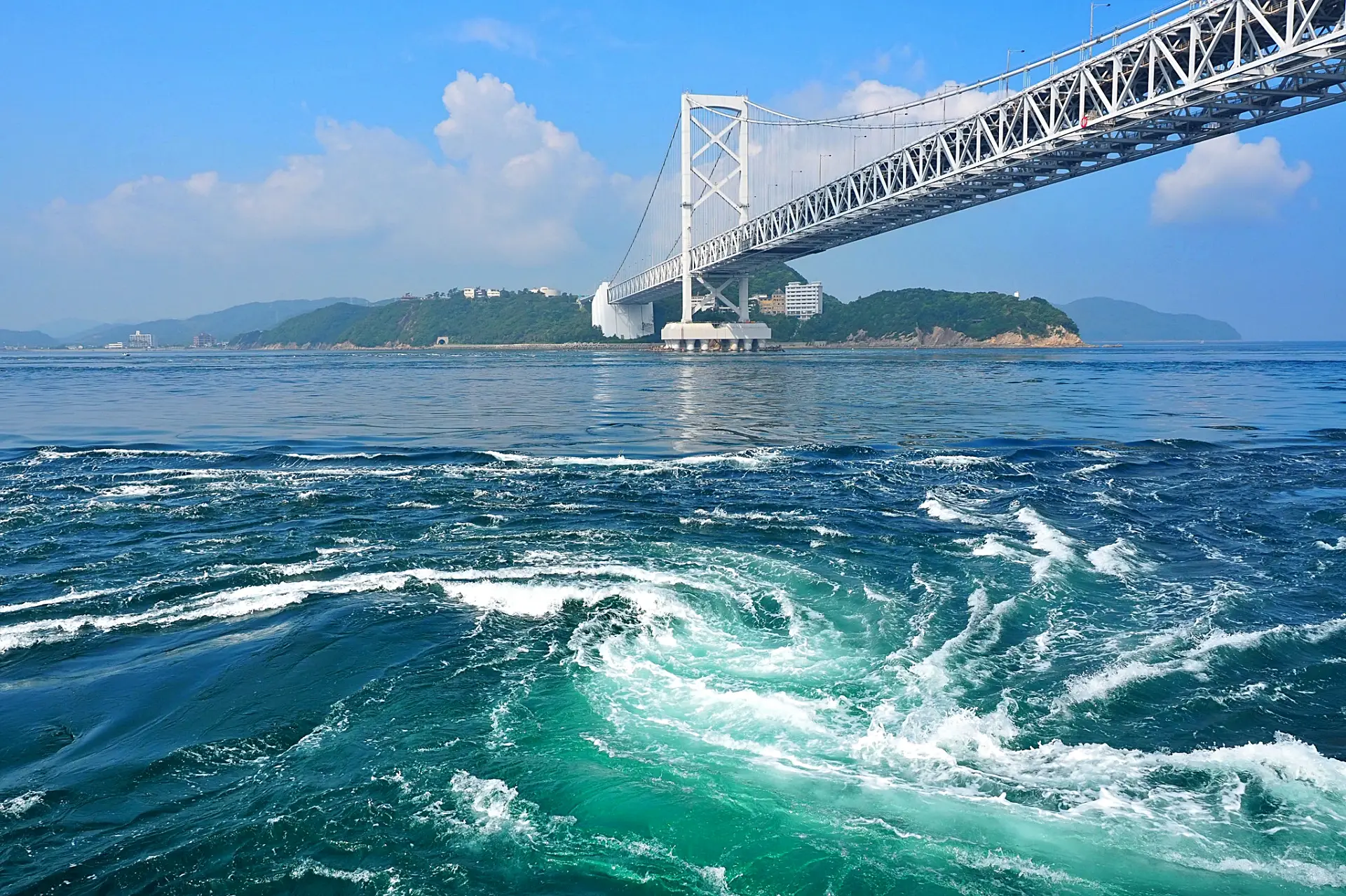 鳴門海峡は世界三大潮流のひとつで、春と秋の大潮の時期には最大30mの渦潮が見られる