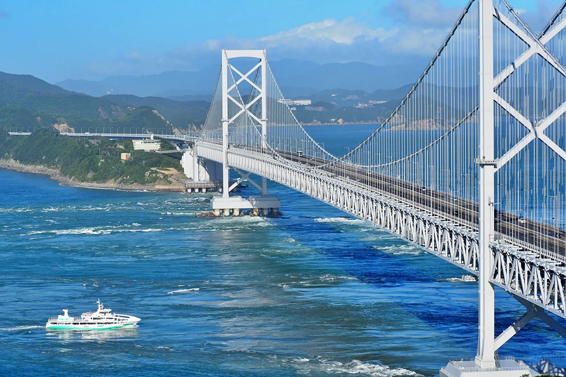 「渦の道」から見た鳴門海峡と観潮船「わんだーなると」。向こう側が淡路島