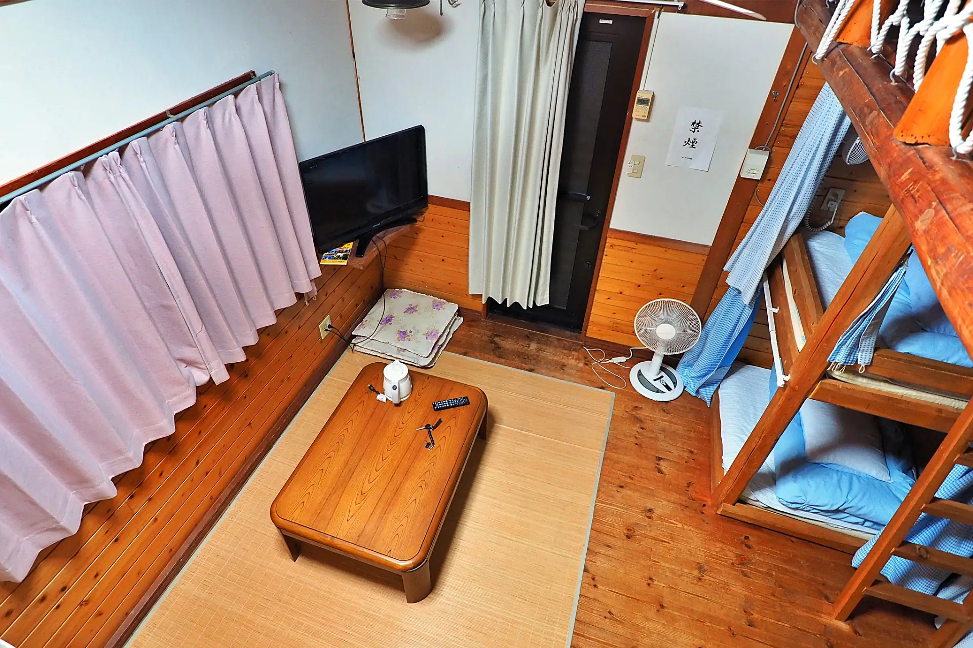 3階のドミトリー部屋。男女同室だがカーテンで個室風に仕切ってある。2800円