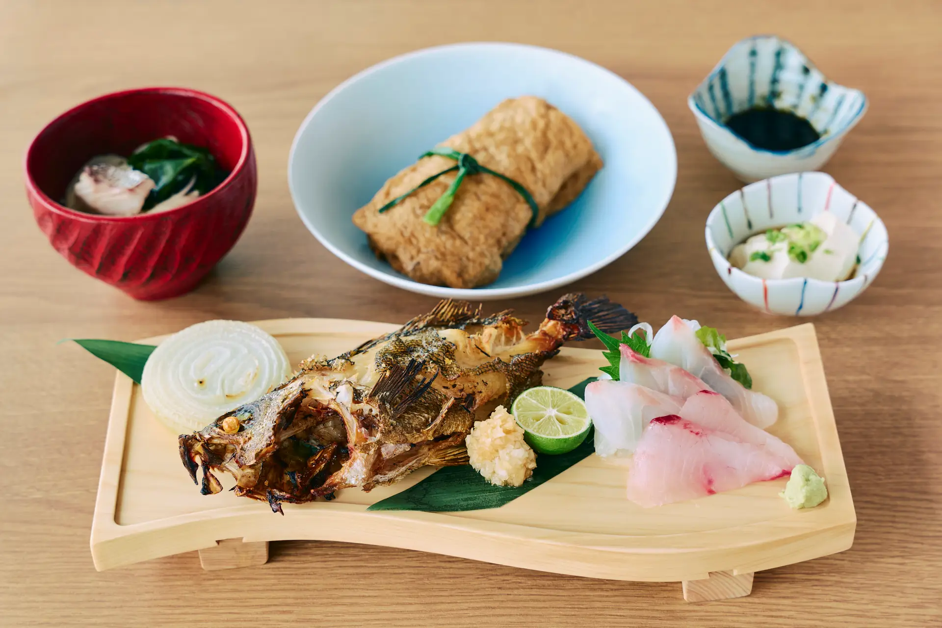 囲炉裏の炭火で仕上げた鮮魚に、出汁ご飯、ご当地の味「鯛素麺」がセットになった「うず潮囲炉裏定食~うずの出汁ご飯~」