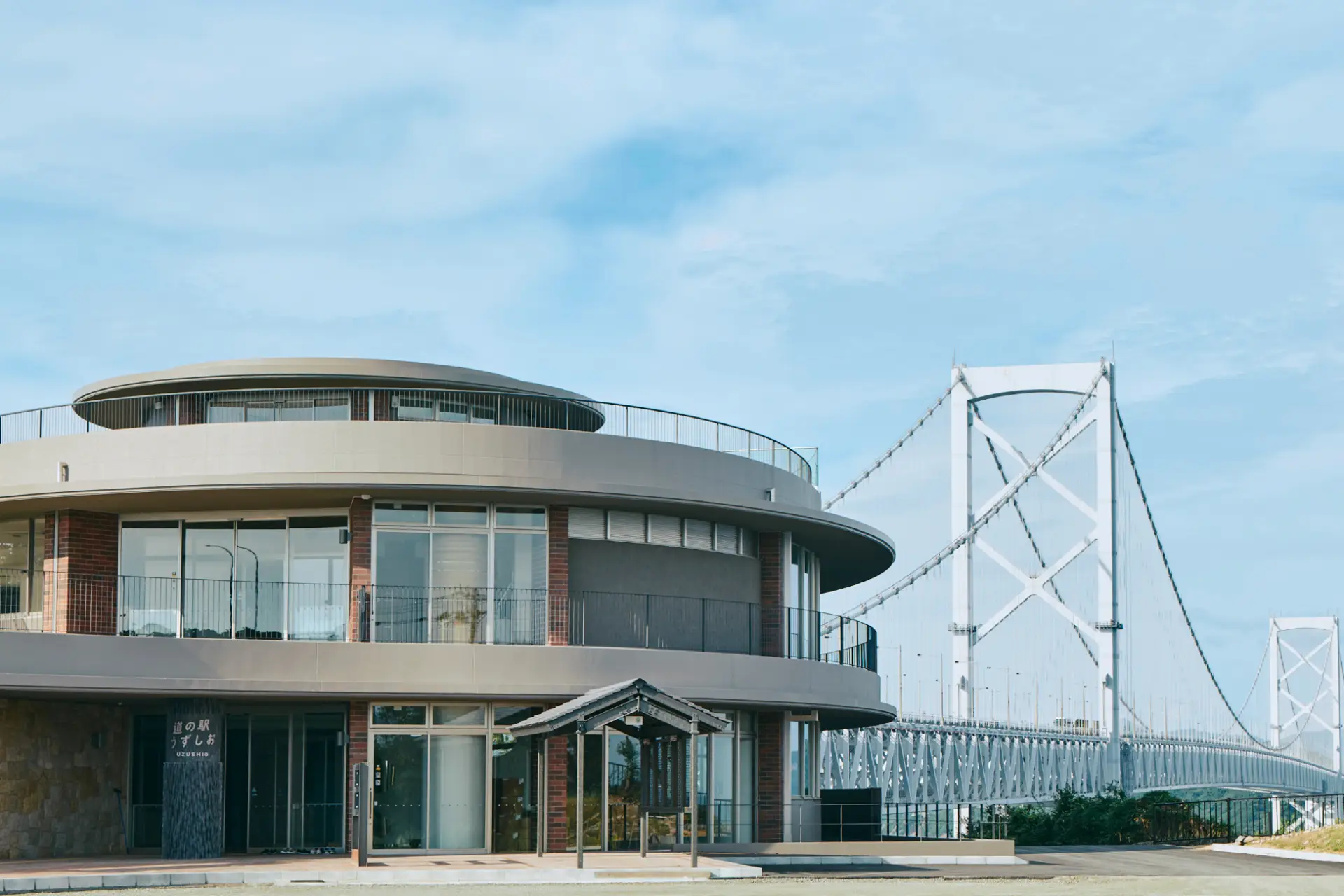 駅の向こうに見えるのは、淡路島と四国を繋ぐ「大鳴門橋」