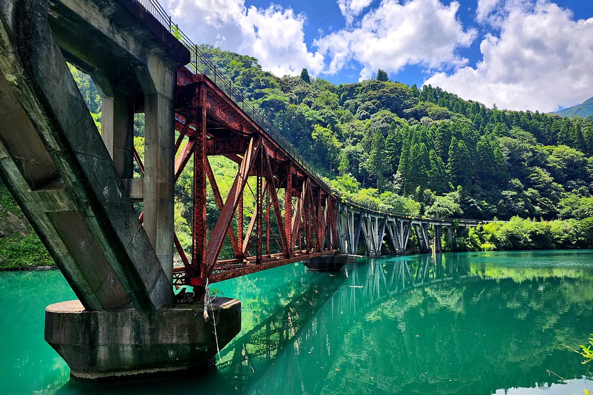 「旧第三五ケ瀬川橋梁」[ツーリングマップル九州沖縄 P.33 L-7] 昭和14年(1939)に完成した全長約268mの鉄道橋。 川の碧に映される姿が神秘的。橋は遊歩道として整備されていて歩いて渡れる