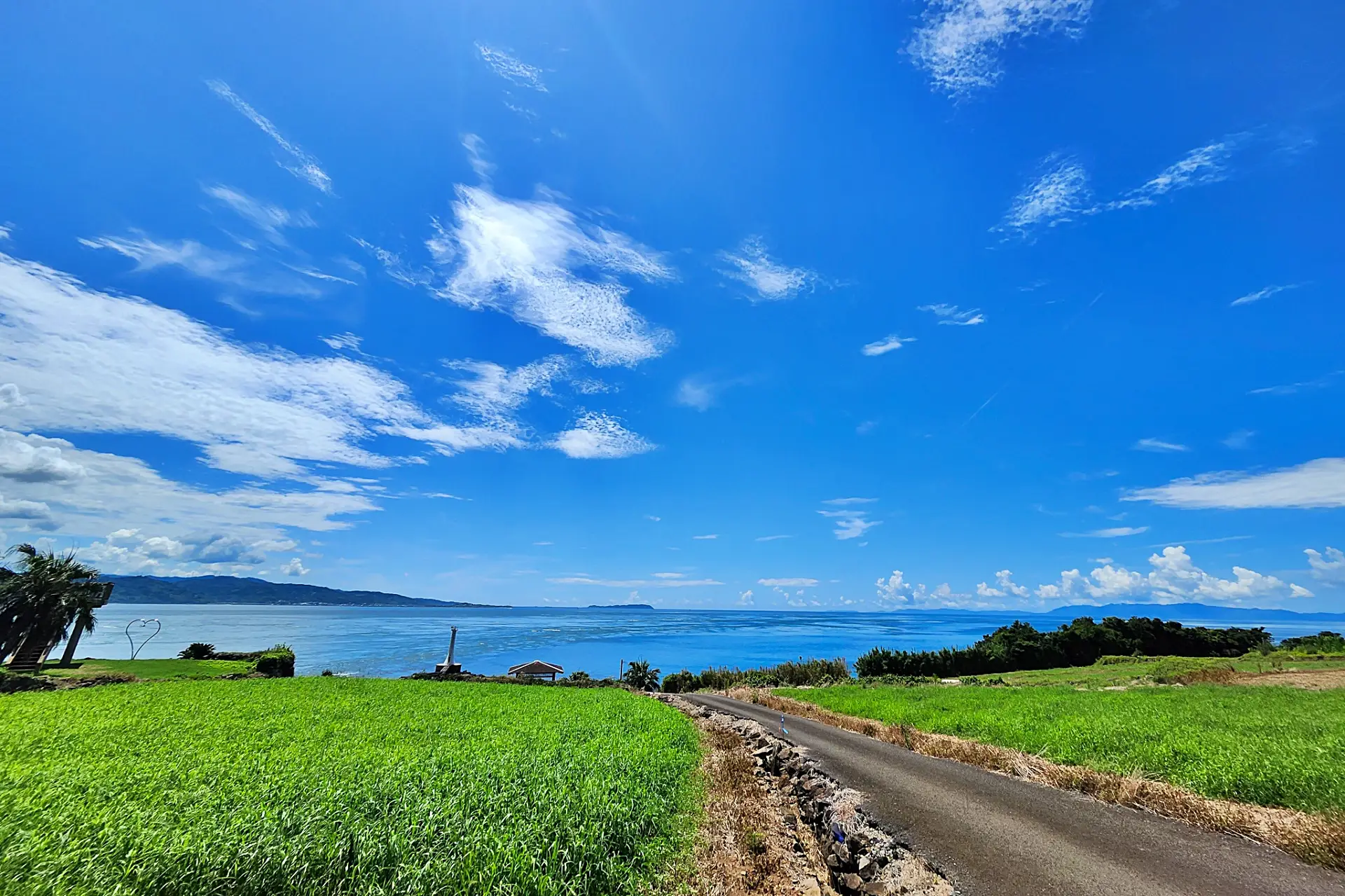 夏の取材で印象的な場所は? と聞かれて真っ先に思い浮かぶ場所は「瀬詰崎」[ツーリングマップル九州沖縄 P.30 K-7]。島原半島の南端にあるココは、天草へ渡る「島鉄フェリー」の港、「口之津港」からすぐのところ。フェリーの出発時刻よりだいぶ早く到着してしまったので、いつも海側からしか見ていなかった先っちょへ行ってみるかと、何気に訪れてみることに。そして、民家を抜け、畑を抜けた先は急に視界が開け、海!