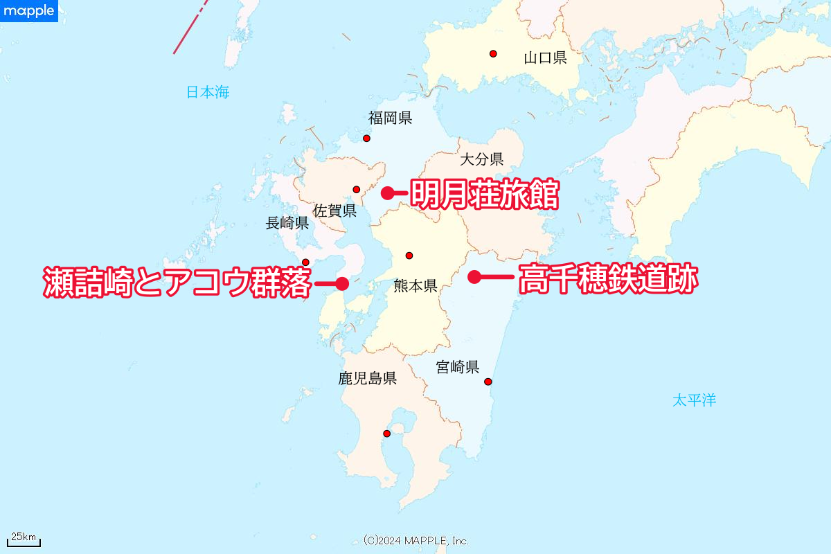 ◆瀬詰崎(せつめざき)とアコウ/長崎県 ◆明月荘旅館/福岡県 ◆高千穂鉄道跡と五ヶ瀬川/宮崎県