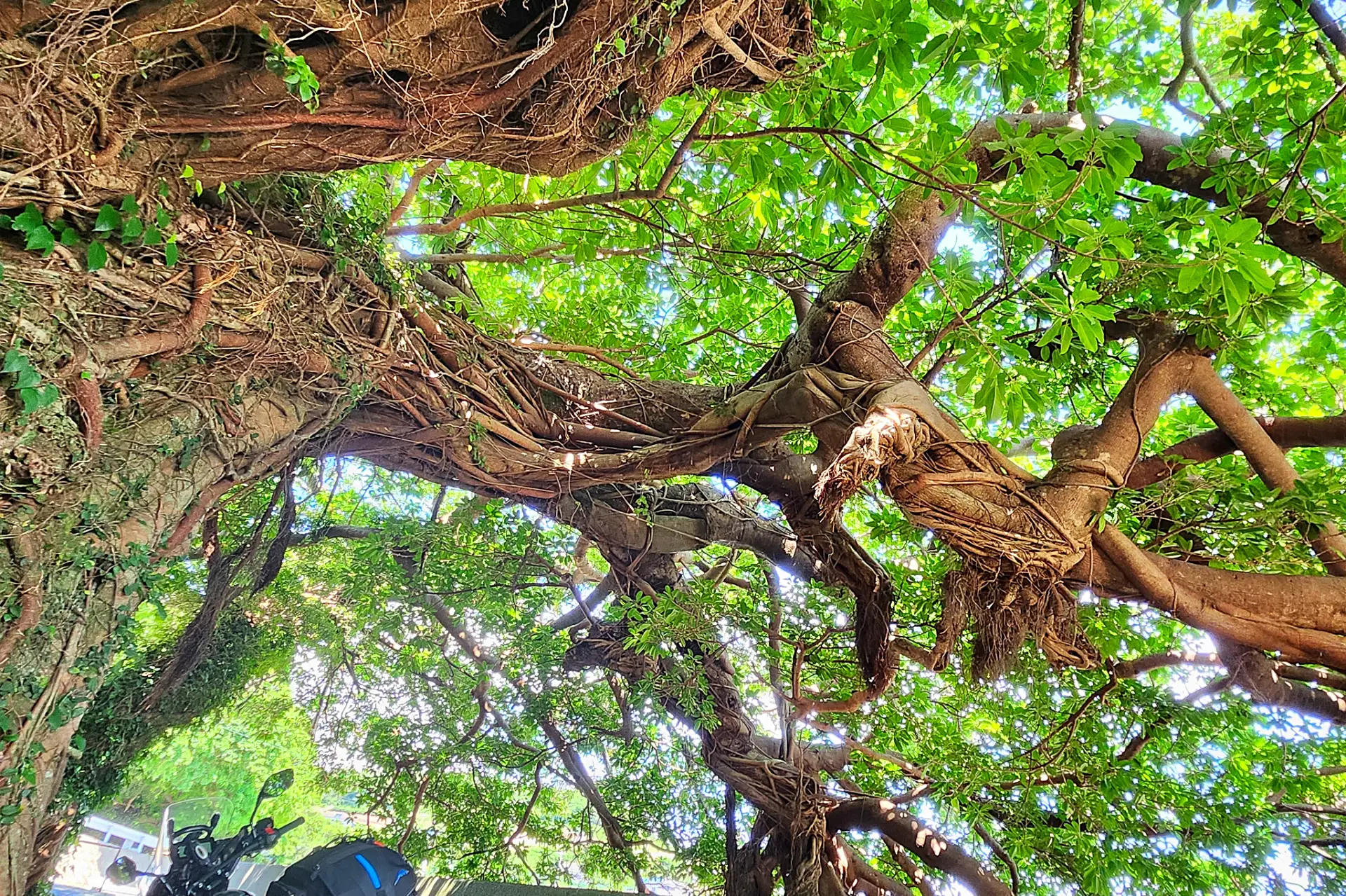 さらに、下へ降りると道があるので、海岸線に沿って少し走ると、巨大なアコウのトンネルに遭遇。そのヒシヒシと伝わる生命力の強さに思わず「スゴイ!スゴイ!」の連発。「何気」に誘われて出会えたこの素晴らしい風景に感動ひとしおなのでした。