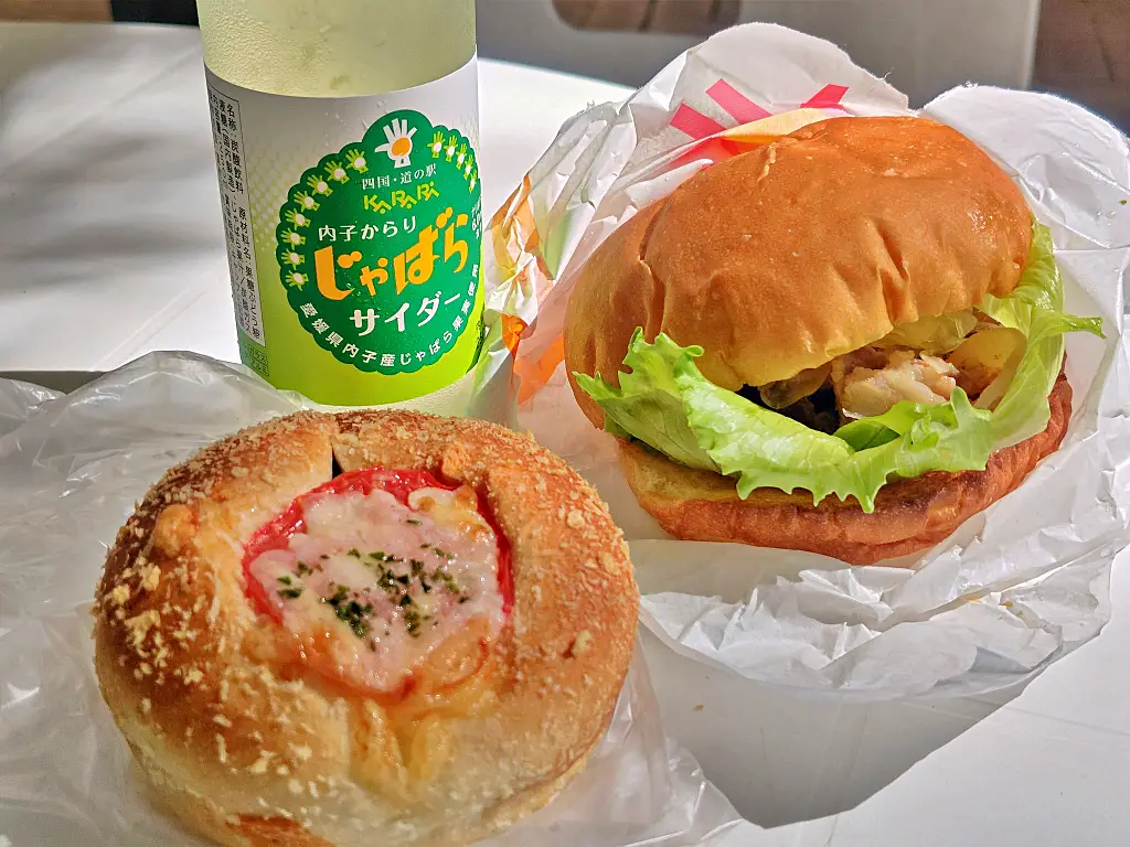 「道の駅 内子フレッシュパークからり」[ツーリングマップル中国・四国 P.82 F-4]内の「からりパン工房」。以前から気になっていた「内子豚もろみ焼きバーガー」を念願の実食。トマトがのった「焼きカレーパン」に、直売所で見つけた「じゃばらサイダー」も美味しかったですね