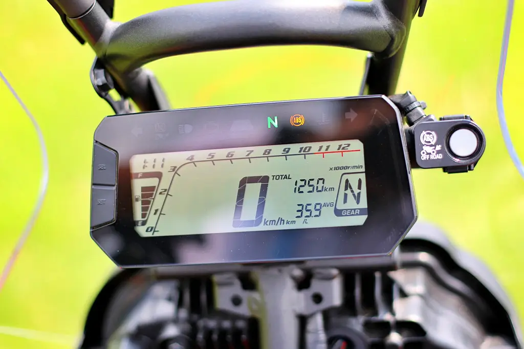 デジタルディスプレイをヘッドライトユニット上に配置。大きい画面で、スピードメーターの文字が見やすい。 燃費計もあって嬉しい。 ディスプレイ右側のボタンはABSスイッチ