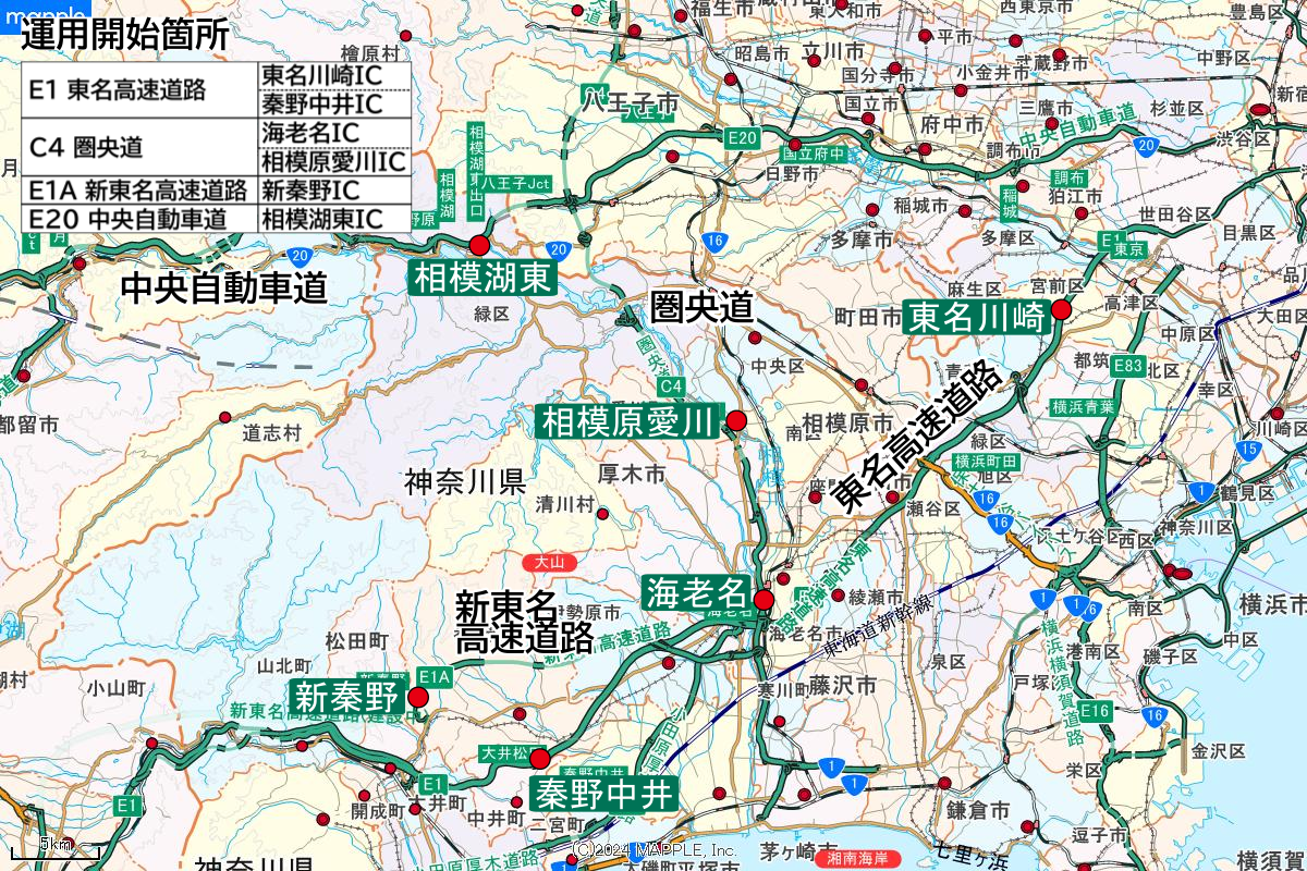 首都圏周辺では、圏央道の「相模原愛川IC」と「海老名IC」で運用開始となり、神奈川県内の圏央道の料金所は、新湘南バイパスと接続する「茅ヶ崎JCT」の料金所以外、すべて「ETC専用料金所」になります。 また、これまで、「ETC専用料金所」が無かった東名高速道路も、「東名川崎IC」と「秦野中井IC」で運用が始まります。