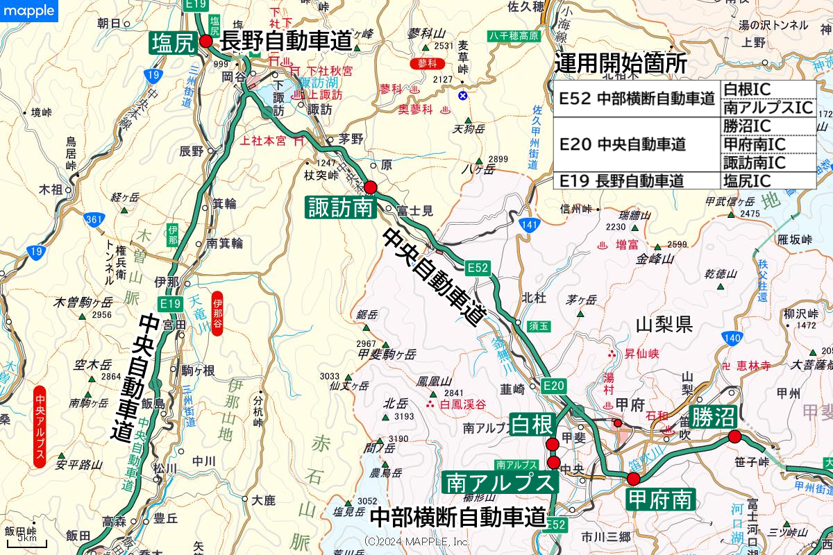長野県、静岡県内でも運用が開始されますが、どちらも県内初の「ETC専用料金所」です。 中部横断道は、山梨県の「白根IC」と「南アルプスIC」で運用開始のため、有料区間の料金所(富士川と富沢の本線料金所は除く)はすべて「ETC専用料金所」になります。