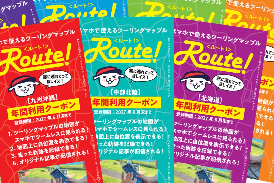 今年度も紙書籍版にはアプリ「Route!」が12 か月間使えるクーポンコードの同梱を継続実施しますよ。 ツーリングマップルがスマホで見られるアプリ「Route!(ルート)」は、継ぎ目なく地図を見ることが でき、自位置の表示や、走行ログを記録することもできます。プランニング時は書籍でパラパラと、出先 ではアプリで現在地を確認しながら、というような併用が大変便利です。詳しくは下記リンクより紹介記事をご覧ください ※2 予告なく機能が変更になる場合があります。 ※3 クーポンコードで使えるのはお買い上げいただいたエリアの地図です。全エリアが使える月額課金版もあります(¥600/月)。書籍に収録されている 地図とアプリの地図は、収録範囲や仕様に一部異なる部分があります。また、電子書籍版にはアプリ利用コードは同梱されません。