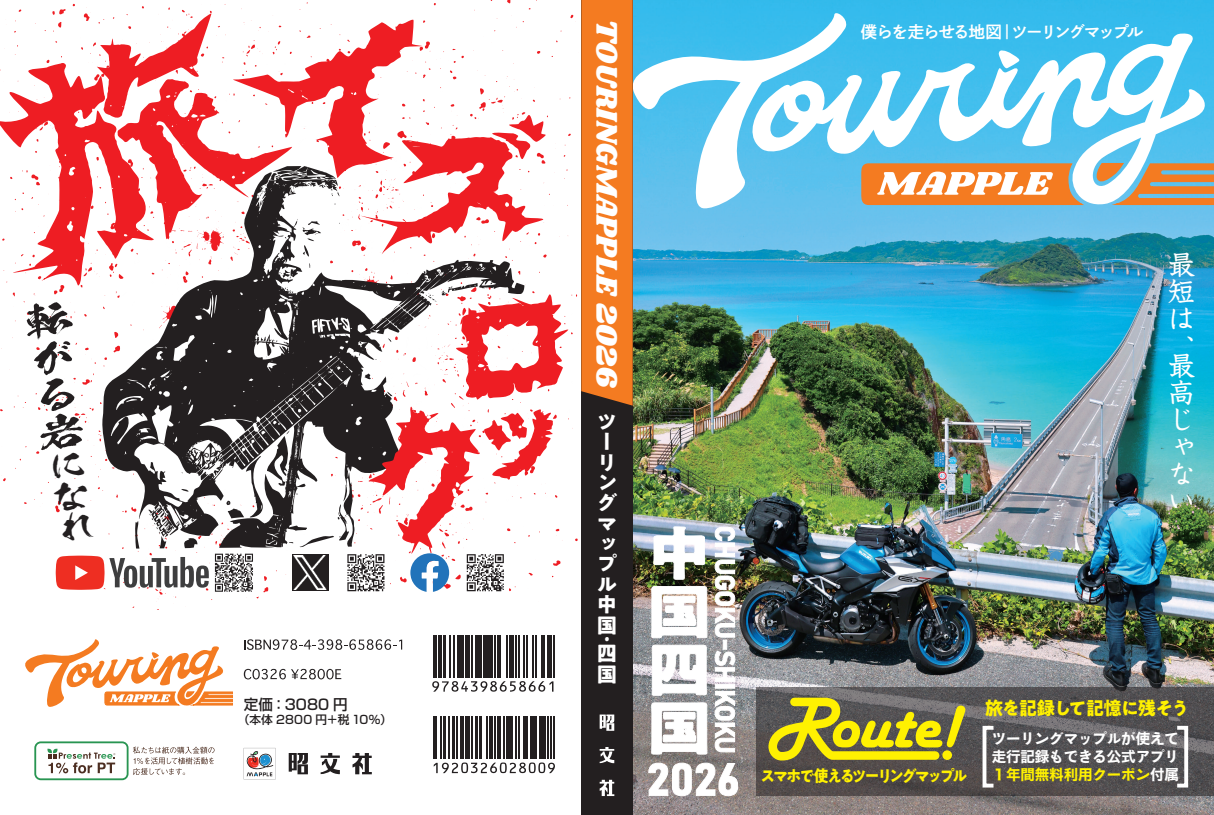 【地図内容の更新】 例年同様、取材担当ライダーによる実走取材やモニター情報などを元に、コメント情報を更新していま す。また昭文社の持つ地図情報や、各種取材網を駆使し、膨大な数の道路や施設の経年情報(開通・開業・ 閉鎖・移転等)にも対応しています。絶景・快走路・ワインディング・ダートなどの道路コメントから、 温泉・道の駅・グルメ・名水・歴史スポット・ダム・キャンプ場など様々なジャンルへのコメントが今年 も新たに追加・修正されています。 【巻頭特集】 巻頭特集では、取材担当者が 26 年度版の取材で出会ったスポットやグルメなどを、写真とともに紹介 します。ここから旅のきっかけを見つけてください。また毎年恒例となった X アカウントで募集してい る「読者投稿写真」もこちらに収録されています。ユーザーの皆さんの道選び、冒険が、別のユーザーさ んの旅へとつながることを期待しています。 【便利な索引ページ】 巻末には掲載範囲内の市区町村や、日帰り湯、キャンプ場の索引を収録。「よみ仮名表示」付きの市区 町村索引、「宿泊の可否」を加えた日帰り湯索引、「 バイクでの乗入可否」の情報が付属するキャンプ場索 引など、役立つ情報をぎっしり詰め込んでいます。 【折りたたみ地図】 表面にはぱっと見で分かりやすい「高速道路網図」、裏面には「書き込み・塗りつぶし」用の正縮尺の 広域図を設けています。特に裏面は、書き込みのしやすさを維持しつつ、地図としての判別性も高めるた め、青と黒の 2 色印刷で作成しました。通ったエリア・道を塗りつぶしたり、プランを記入したりなど、 旅の記録にご活用いただけます。 以上、ツーリングマップル2026は3月13日発売開始です!最短は、最高じゃないぜ!よろしくお願いします!
