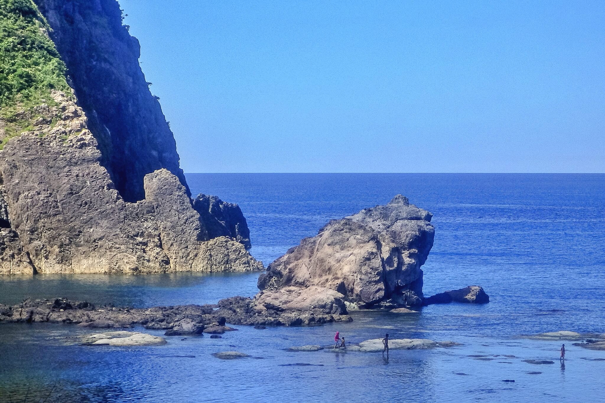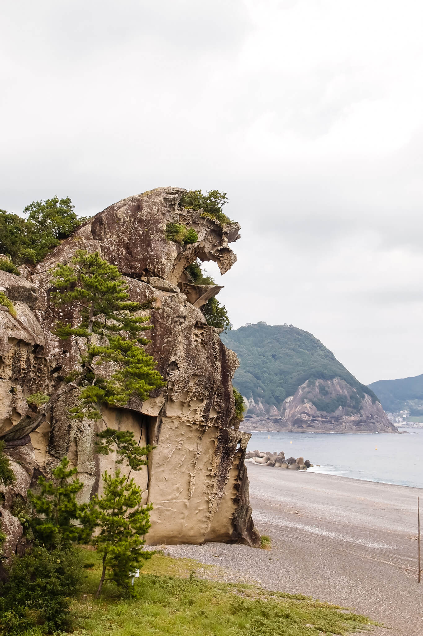 北海道久遠郡せたな町(北海道 5 E-3) 年々熊害報道が多くなっています。人里に降りてきた熊。いろいろとご意見あるかと思います。イメージはどんどん怖いものになりつつありますが、まあ身勝手なことを言えば、安全な位置から見る熊、とくに子熊の可愛さにはやはりキュンとなりますわな。そんな、かわいい子熊が母さん熊に甘えて「ハイハイ、なあに?」とあやされているような姿が思い浮かぶ岩がこちら。北海道せたな町の「親小熊岩」です。これは素晴らしい。写真を撮るときは、やはりシルエットになる時間がおすすめですが、日中でも、トリミングして熊らしく見える部分だけ撮るとより良い感じに撮れると思いますよ。