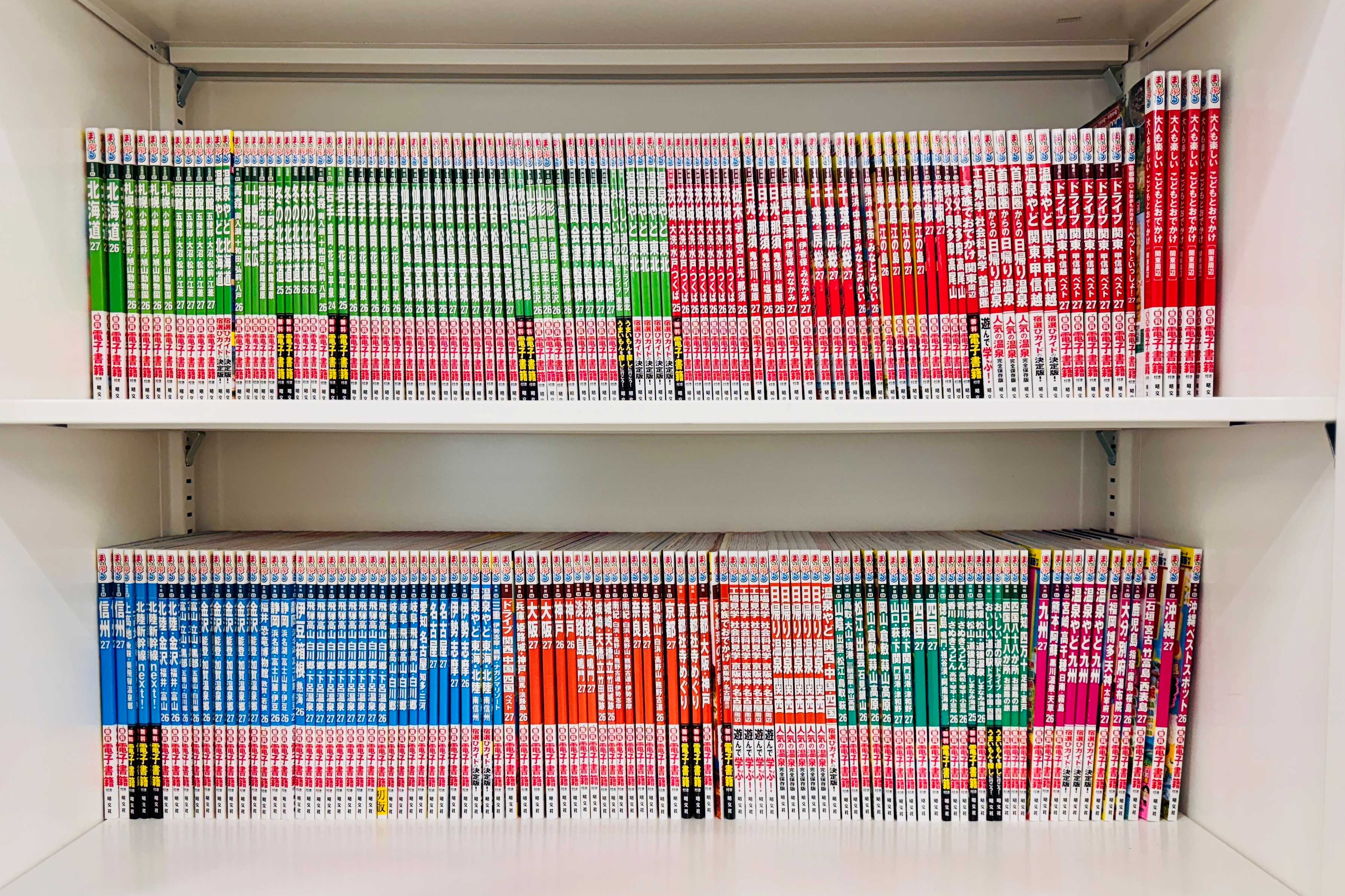 まっぷるマガジンシリーズ。上段左から「北海道&東北(緑)」「関東(赤)」、下段左から「中部北陸(青)」「関西(オレンジ)」「中四国(深緑)」「九州沖縄(ピンク)」