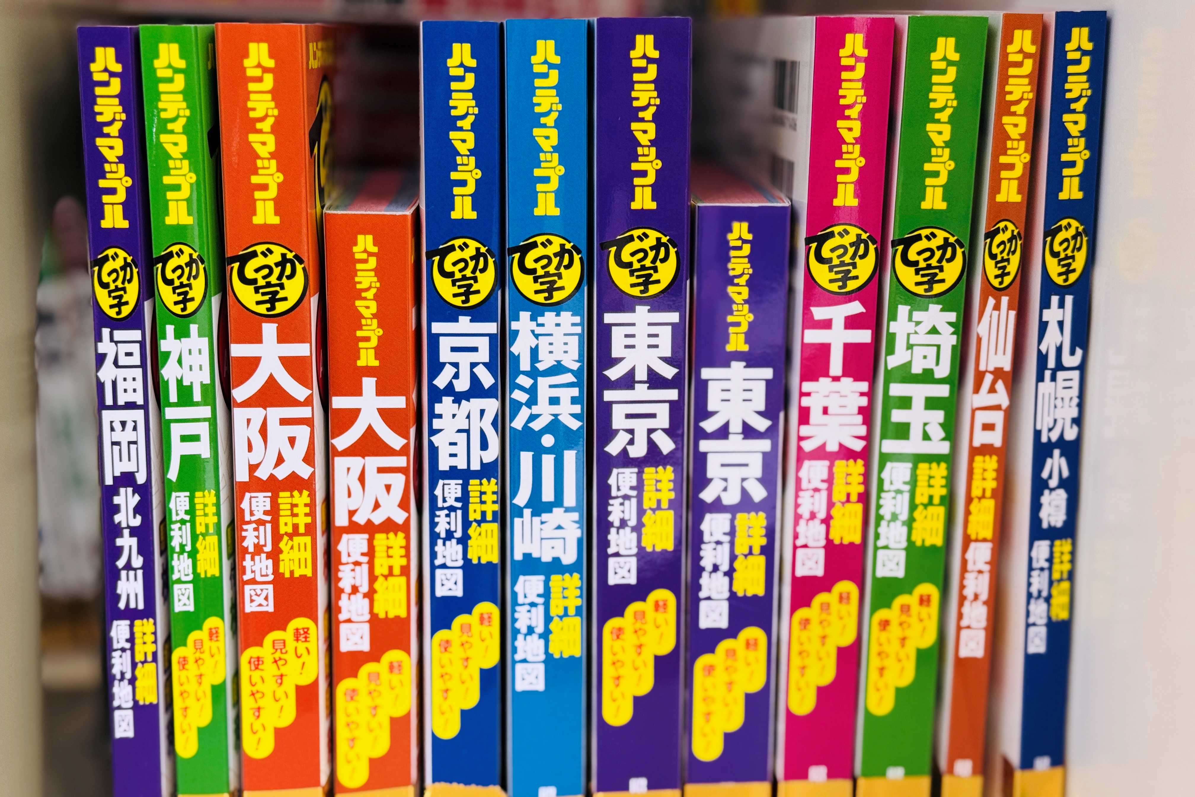 ライトマップルシリーズ。左から、「北海道(水色)」「東北(黄緑)」「関東(薄紫?)」「中部北陸(緑)」「関西(濃オレンジ)」「中四国(薄オレンジ)」「九州沖縄(ピンク)」