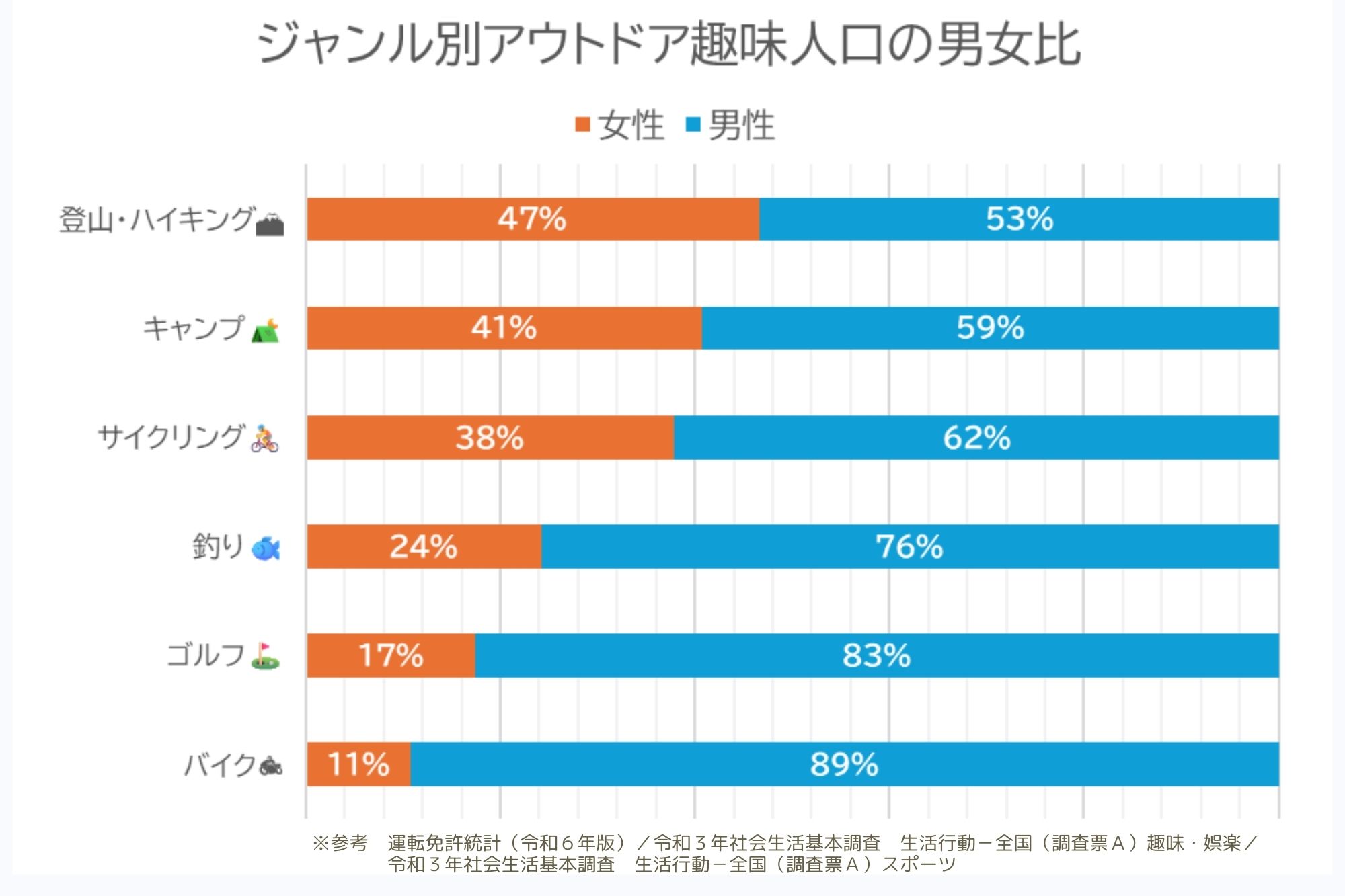 山は、現地での体感としては女性の方がむしろ多い気すらする。山によるんだろうけど。釣りの数字は意外である。