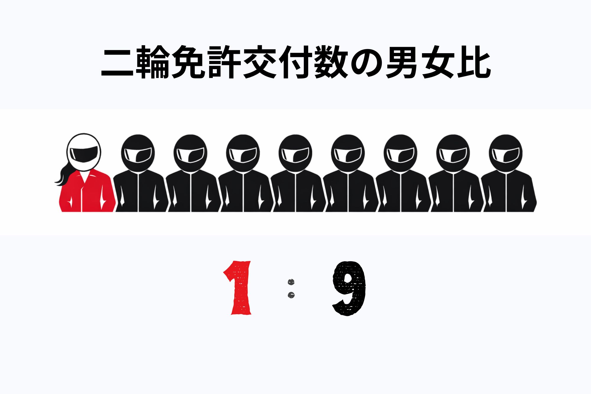 まずは免許統計を調べてみよう。実際に乗っている・いないは別として、「わざわざ」取る必要のある普通二輪と大型二輪の免許交付数を男女それぞれで合算してみた。 男性≒1639.6万(89%) 女性≒196.8万(11%) やはりおおむね9:1といったところだ。 ※同一人物が普通二輪と大型二輪を持っている場合は2カウントしている。これがそのまま「免許保有者数」ではない点はご注意を。