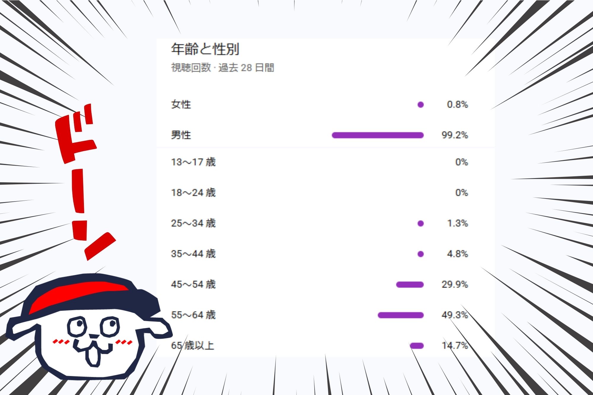 我々のチャンネル視聴者の属性。99.2%が男性・・・おい本気か?