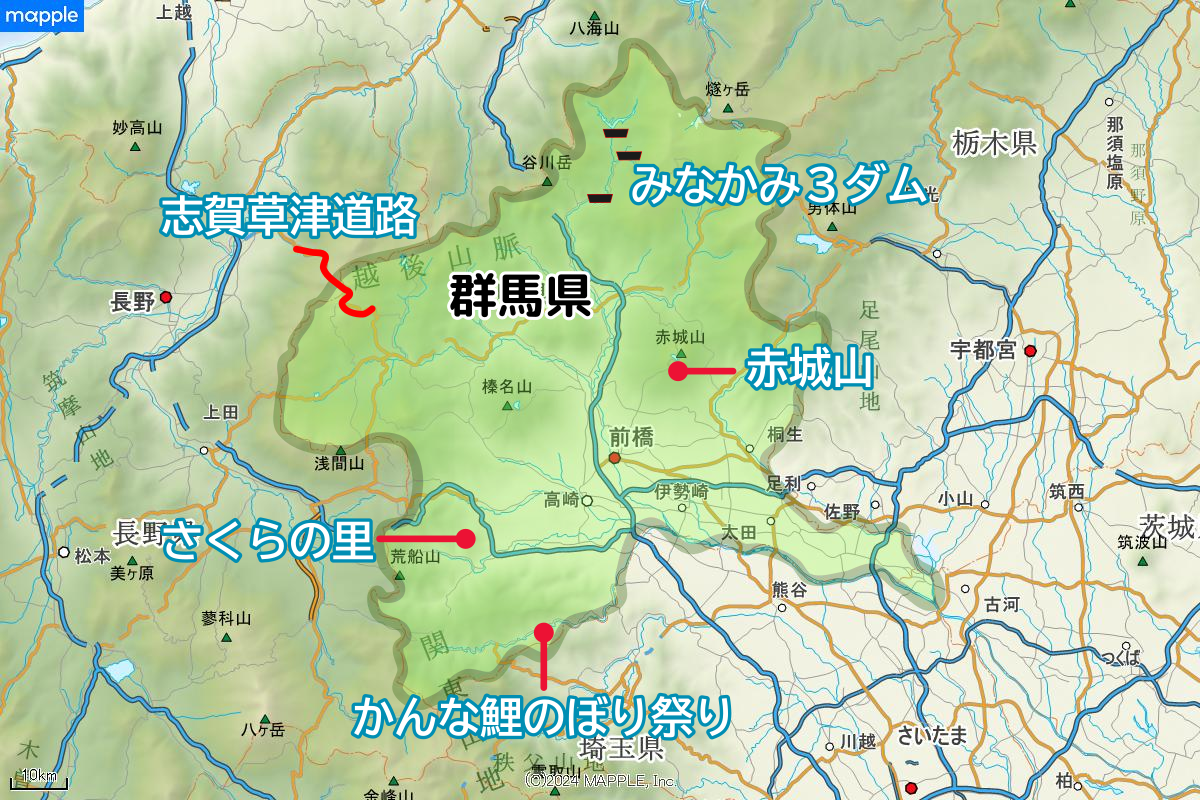 1.妙義山「さくらの里」 花の見ごろ:4月上旬~下旬 2.かんな鯉のぼり祭り 開催日:4月26日~5月10日 3.赤城山のツツジ 花の見ごろ:5月下旬~6月中旬 4.志賀草津道路 4月下旬~5月上旬※2026年の通行再開日は未定、例年4月中旬~下旬 5.みなかみ3ダム春の点検大放流 開催日:5月17日藤原ダム・奈良俣ダム/5月18日矢木沢ダム