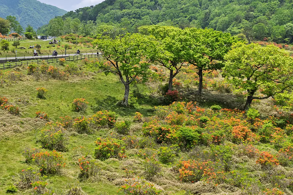 「赤城山総合観光案内所」から見る、ツツジが咲きほこる「白樺牧場」