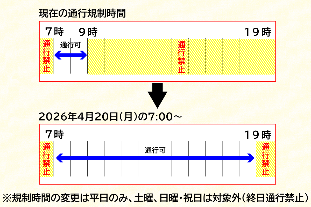 今回の規制緩和の詳細。平日の昼間であれば二輪車で通行できるようになる。土・日曜、祝日の終日通行禁止規制は継続