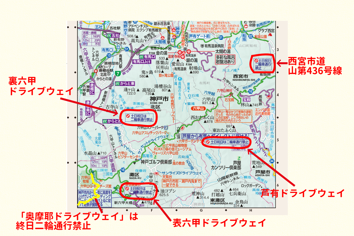 近畿地方で二輪規制が集中しているのが、こちらも人気エリアの六甲山周辺です。平日は問題ないのですが、土日祝日は各所で二輪車が通行禁止になります。